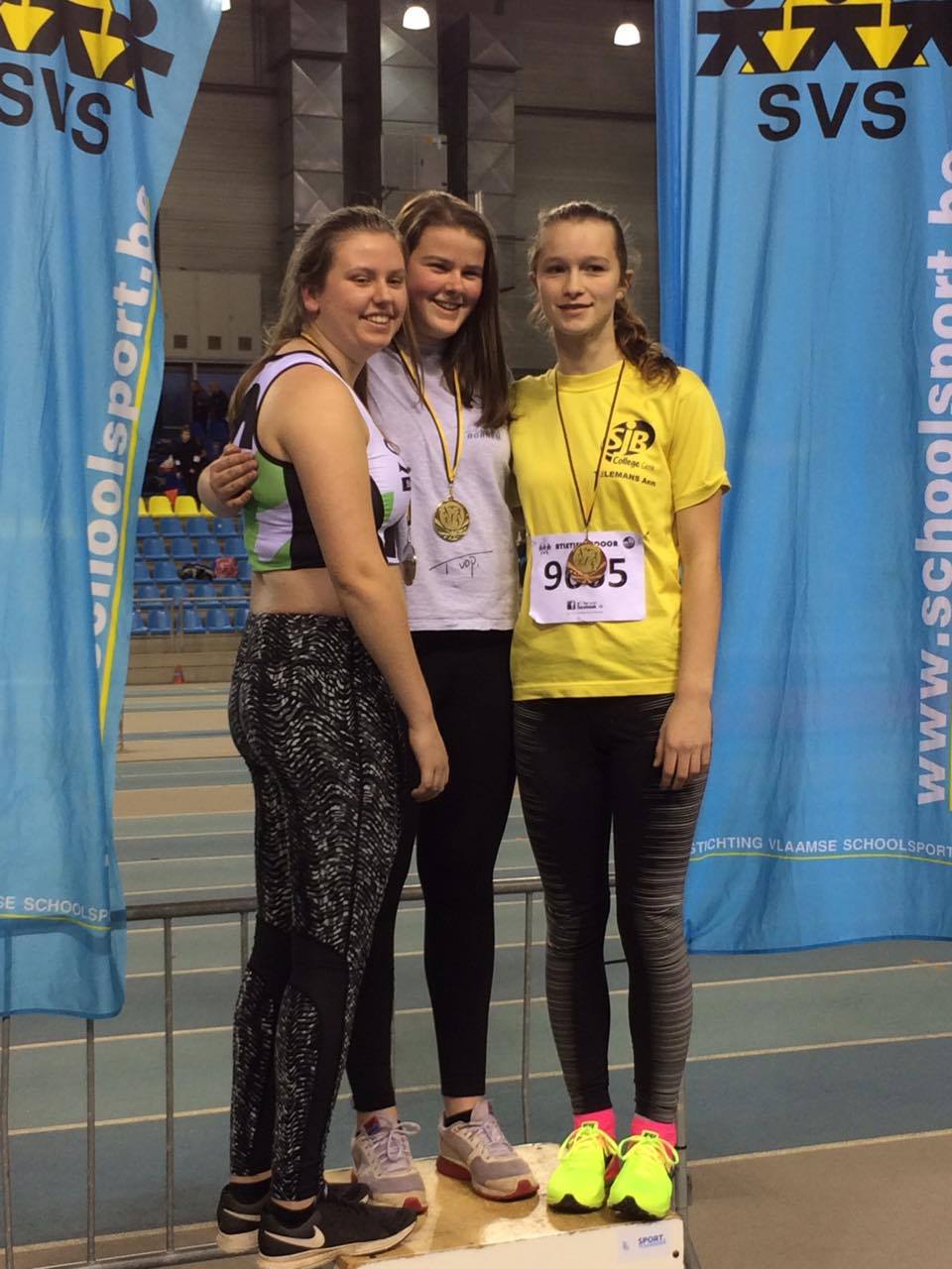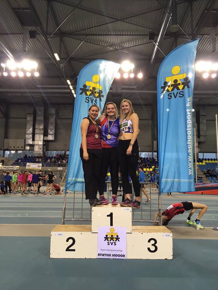 Nu de jongens gedaan hadden, was het de beurt aan de meisjes met o.a. Myrthe Van der Borght. Na een goede opwarming en een aarzelende eerste worp, knalde ze naar 14m61. Goed voor de overwinning, een nieuw PR, CR en opnieuw de 7de plaats aller tijden bij de scholieren meisjes. (Na het KvV 2 weken geleden, was ze een plaatsje gezakt.) Niet slecht voor een eerste jaars ;-). Onze VS-polsstokspringster Lotte Van Der Snickt wou het ook eens proberen met de kogel en realiseerde met 7m97 een mooie prestatie in haar allereerste wedstrijd. Eerder op de namiddag nam ze deel aan de 60m. Ook deze discipline stond voor het eerst op haar programma. Ze won kanp haar reeks in 8″56.