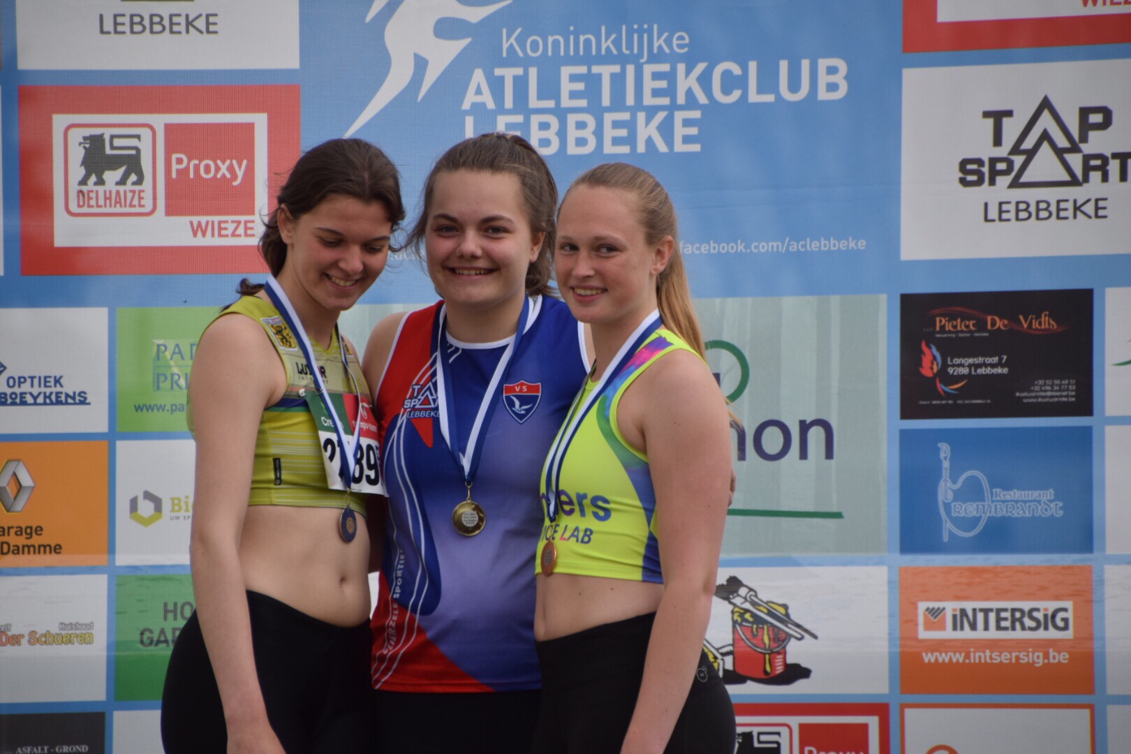 Bij de scholieren meisjes waren alle ogen gericht op Myrthe Van der Borght. In het discuswerpen begon ze zeer sterk met enkele worpen rond de 40m, tot ze in haar 5de poging haar discus mooi “plat” kreeg en hem dus prima raakte. GOUD met 43m50 en een nieuw clubrecord was het resultaat! Daarna trok ze naar het kogelstoten, haar beste nummer. Het werd een lange wedstrijd met 15 deelneemsters. Myrthe voelde de vermoeidheid van een zware trainingsperiode wat opkomen en stootte voor haar doen een matige wedstrijd. Haar 14m60 was wel ruim voldoende voor een 2de keer GOUD deze namiddag.
