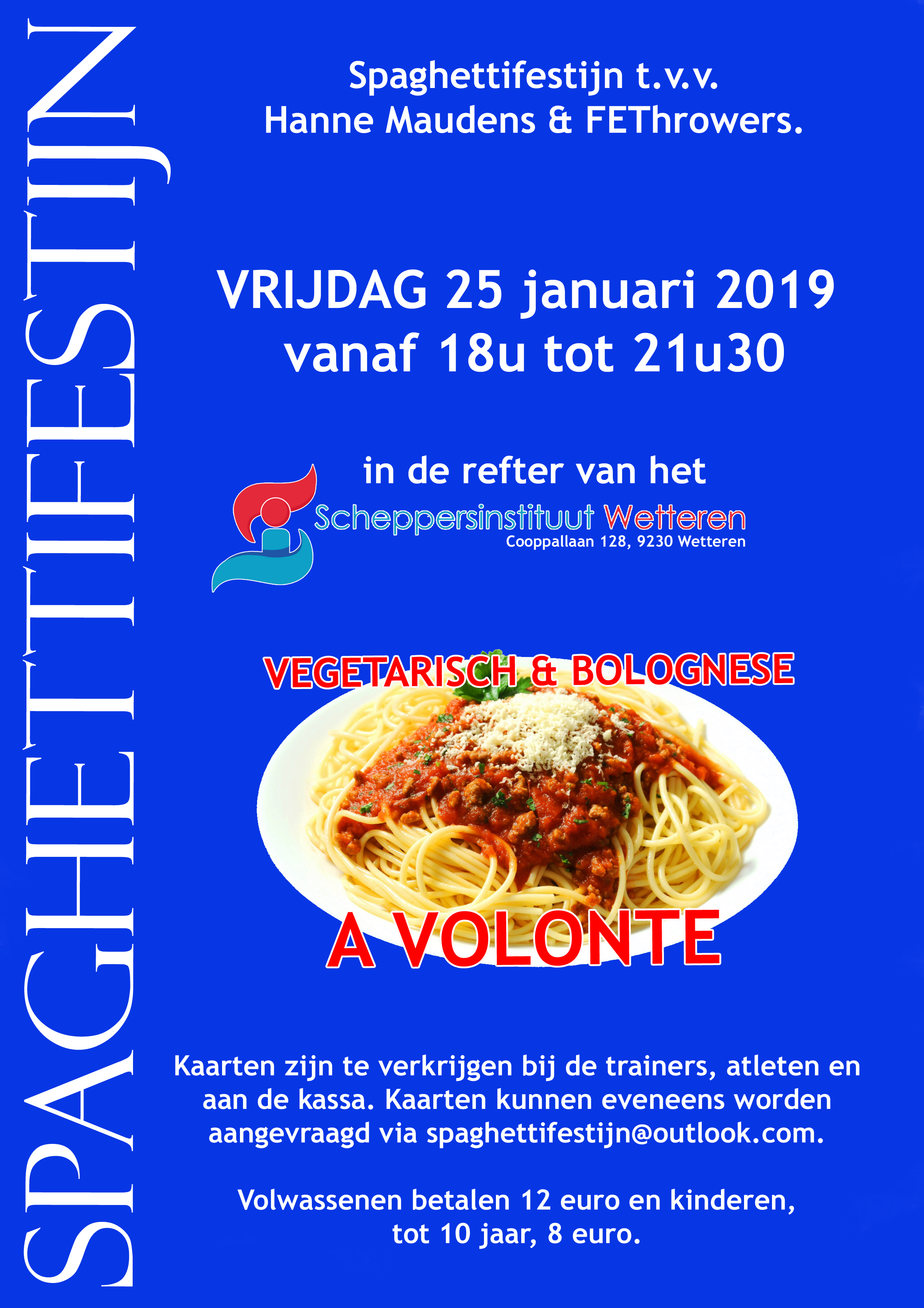 Langs deze weg nodigen de FEThrowers U uit op het 6de spaghettifestijn t.v.v. Hanne Maudens en onze werpers. Op vrijdag 25 januari 2019 verwelkomen we u heel graag in de refter van het Scheppersinstituut te Wetteren (Cooppallaan 128, 9230 Wetteren) vanaf 18u. Kaarten zijn te verkrijgen bij Hanne, de FEThrowers en aan de kassa voor slechts 12 euro. Door dit formulier in te vullen of een mailtje te sturen naar spaghettifestijn@outlook.com kunnen (extra) kaarten bekomen worden.