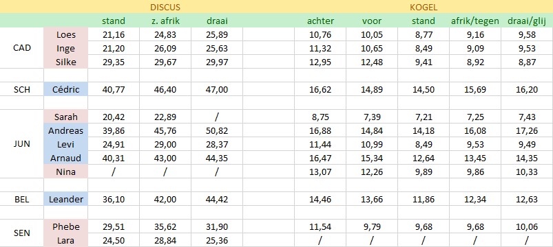 Op donderdag was er terug een rustdag voor de groep. Enkel Cédric, Andreas en Leander werkten een outdoor powertraining af. Zo gaan de dagen snel voorbij en zijn we reeds bij onze laatste dag aanbeland. Traditioneel staat deze dag in het teken van enkele werptestjes. Een overzicht van alle resultaten kan u hiernaast raadplegen.