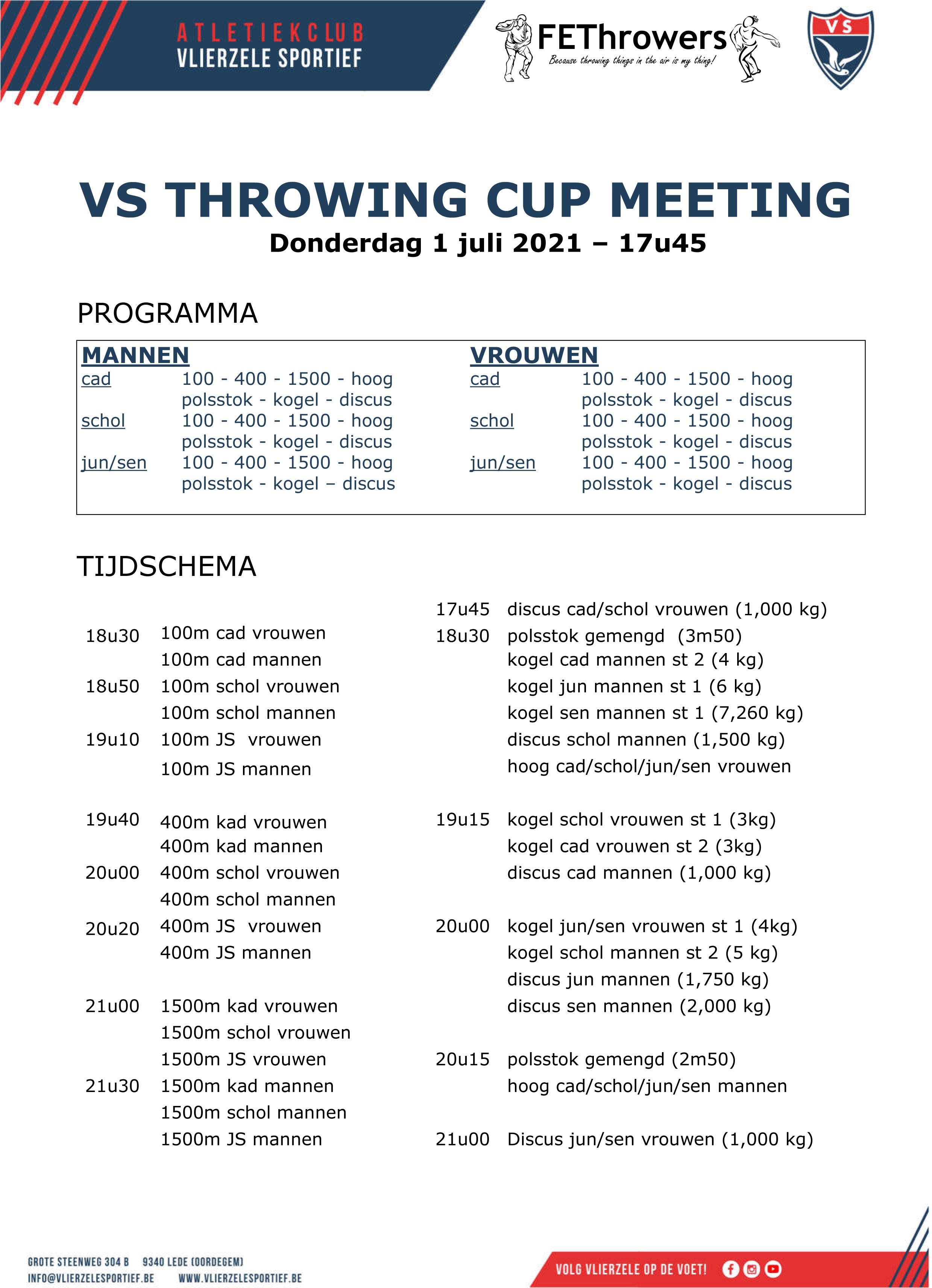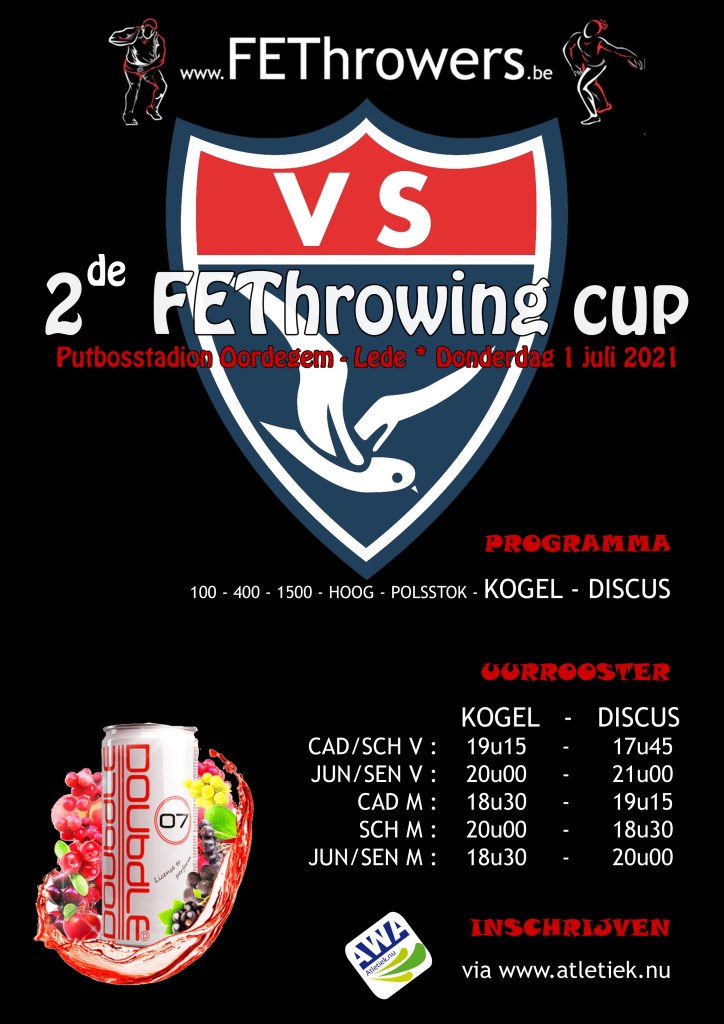 Stukje bij beetje hernemen we het gewone leven, ook in de atletiekwereld worden de wedstrijden hervat en kijken we uit naar een nog rijk gevulde sportzomer. Heel wat atleten staan immers te popelen om hun vorm te tonen. Na 8 maand zonder competities, is de honger naar wedstrijden dan ook groot. Langs deze weg nodigen wij jullie heel graag uit voor onze 2de FEThrowing cup! Vorig jaar werd deze wedstrijd nog als een oefenwedstrijd in clubverband georganiseerd. Nu kunnen we trots aankondigen dat onze cup deel uit maakt van een officiële wedstrijd, de “VS Throwing Cup Meeting”. Voor elke categorie staat er naast kogel en discus ook nog 100m, 400m, 1500m, hoog en polsstok op het programma.