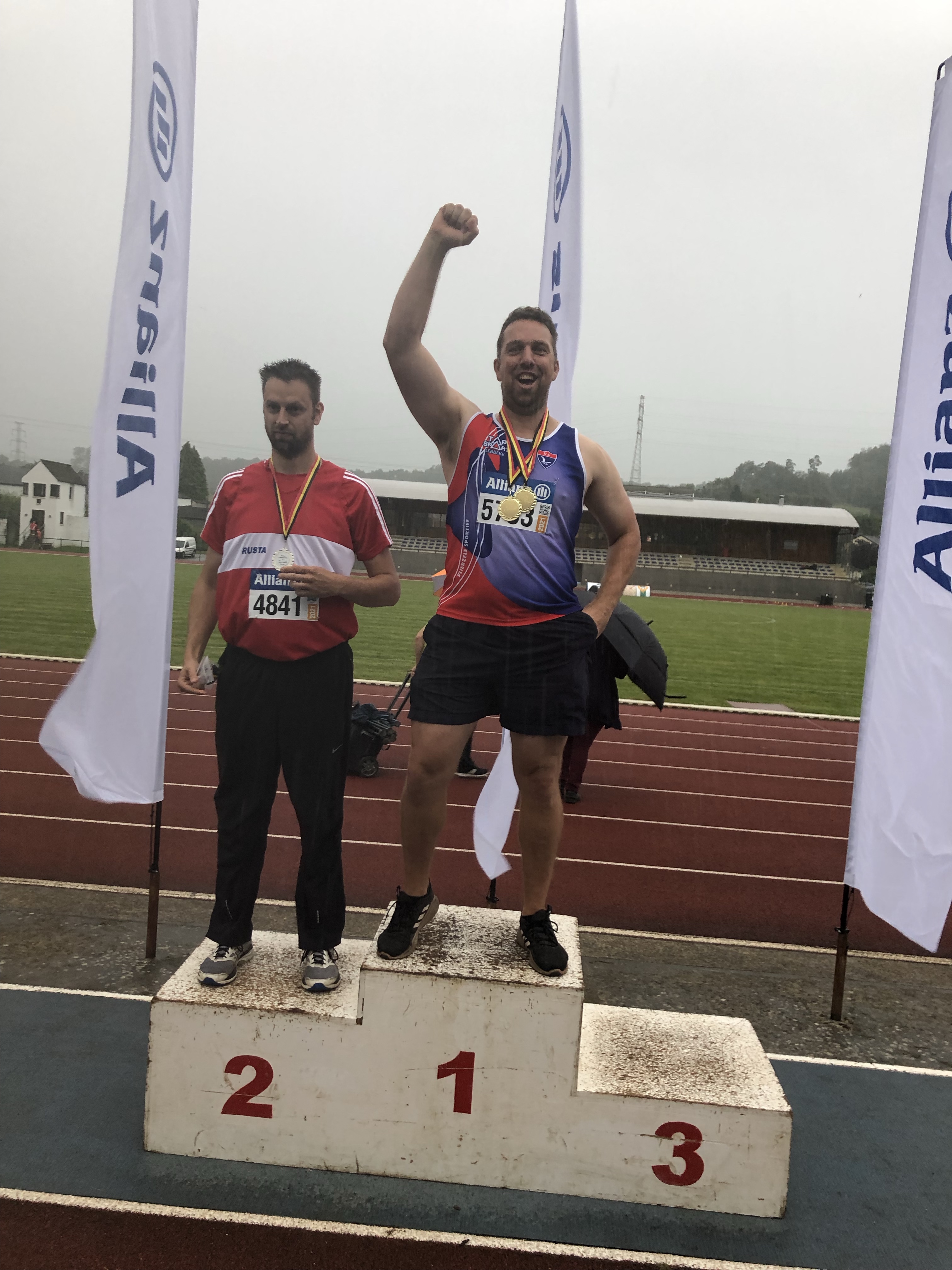 Voor de masters M40 stond het gewichtwerpen en hamerslingeren pas in de late namiddag op het programma. Best handig als je weet dat de piste van Dampicourt op ruim 250km van Lede ligt… Filip mocht met 2 gouden medailles huiswaarts. In het hamerslingeren (7,26kg) realiseerde hij een degelijke 37m14. Zijn beste prestatie kwam er in het gewichtwerpen (15,88kg) waar hij met 13m38 een dik nieuw PR en clubrecord realiseerde.