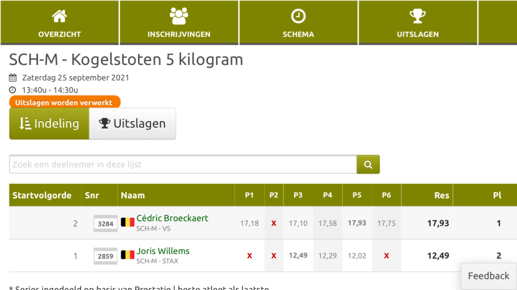 Ons verslag beginnen we met onze man in topvorm, Cédric. Vorige week nog bracht hij zijn PR op 17m43. Wel, vandaag deed hij liefst 3x beter, om uiteindelijk met 17m93 zijn record met een halve meter scherper te stellen! Een ongelooflijk knappe prestatie die hem naast een PR en clubrecord ook nog een 4de plaats allertijden opleverde. In het discuswerpen presteerde hij dan weer wat minder met 46m30. Maar na zo een straffe kogelprestatie is hem dat met alle plezier vergeven 😉 !