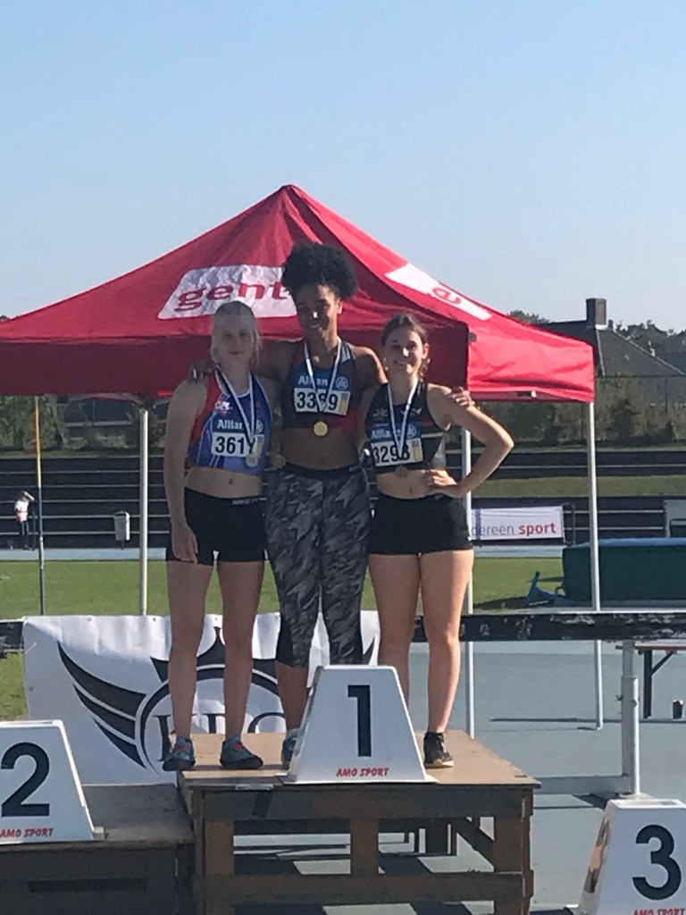 Bij de scholieren kwam speerwerpster Emma De Landsheere in actie op, voor haar, ongewone werpnummers! Zo traint ze wel af en toe op het kogelstoten maar bijvoorbeeld nooit op het discuswerpen… tot ze na het BK (half september) toch een paar keer de discus mocht weggooien op training… Dat ze aanleg heeft, mag duidelijk zijn want in zowel het kogelstoten als discuswerpen deed ze het met 11m09 en 32m87 goed. Het leverde haar respectievelijk een knappe 3de en 2de plaats op!
