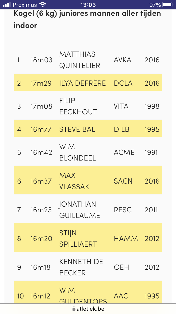 Spitsbroeder en 2de jaars junior Andreas is op training ook al een tijdje in fantastische doen. De belangrijkste vraag die we ons stelden was, of er voldoende indoorwedstrijden zouden zijn deze winter om zijn huidige vorm te kunnen etaleren. Wel, zijn openingswedstrijd mag er alvast zijn. Hij realiseerde vandaag reeds onmiddellijk een ongelooflijk straffe 17m59. Hiermee verpulverde hij zijn outdoor PR, realiseerde hij een nieuw clubrecord en bezet hij de 2de plaats allertijden bij de junioren!