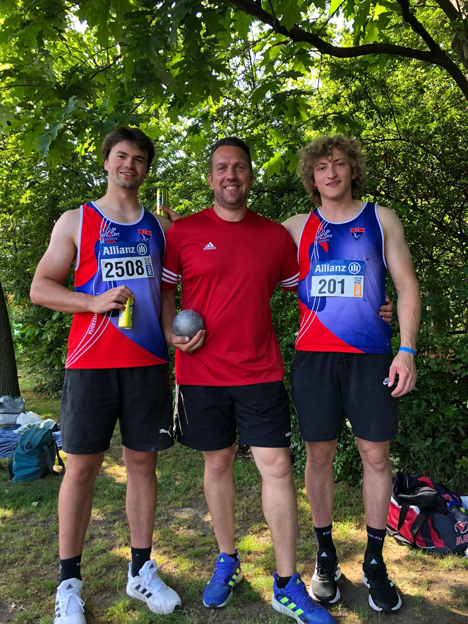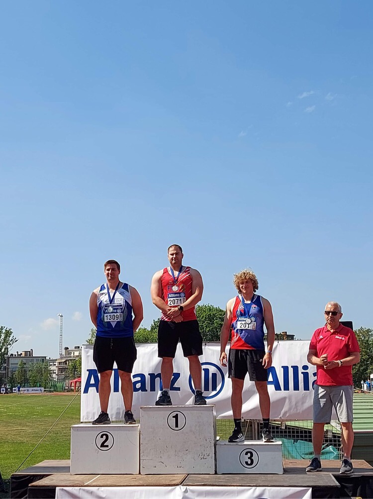 Beginnen doen we met het kogelstoten. Daar zette Andreas een enorm sterke reeks neer met 3 worpen van boven de 16m. Zijn beste worp van 16m16 was goed voor de 3de plaats, een nieuw PR en clubrecord. Hij strandde ook nog op amper 7cm van het Belgisch record bij de juniors met 7,260kg. Op een 6de plaats zagen we trainer Filip met 14m42. Van je trainer moet je het hebben, moet Leander gedacht hebben want hij viel net buiten de top 8 en de daar bijhorende 3 extra pogingen. Hij werd 9de met 13m67 en bleef dus wat op zijn honger zitten… maar niet getreurd, dit geeft hem normaal heel wat extra energie voor het discuswerpen.