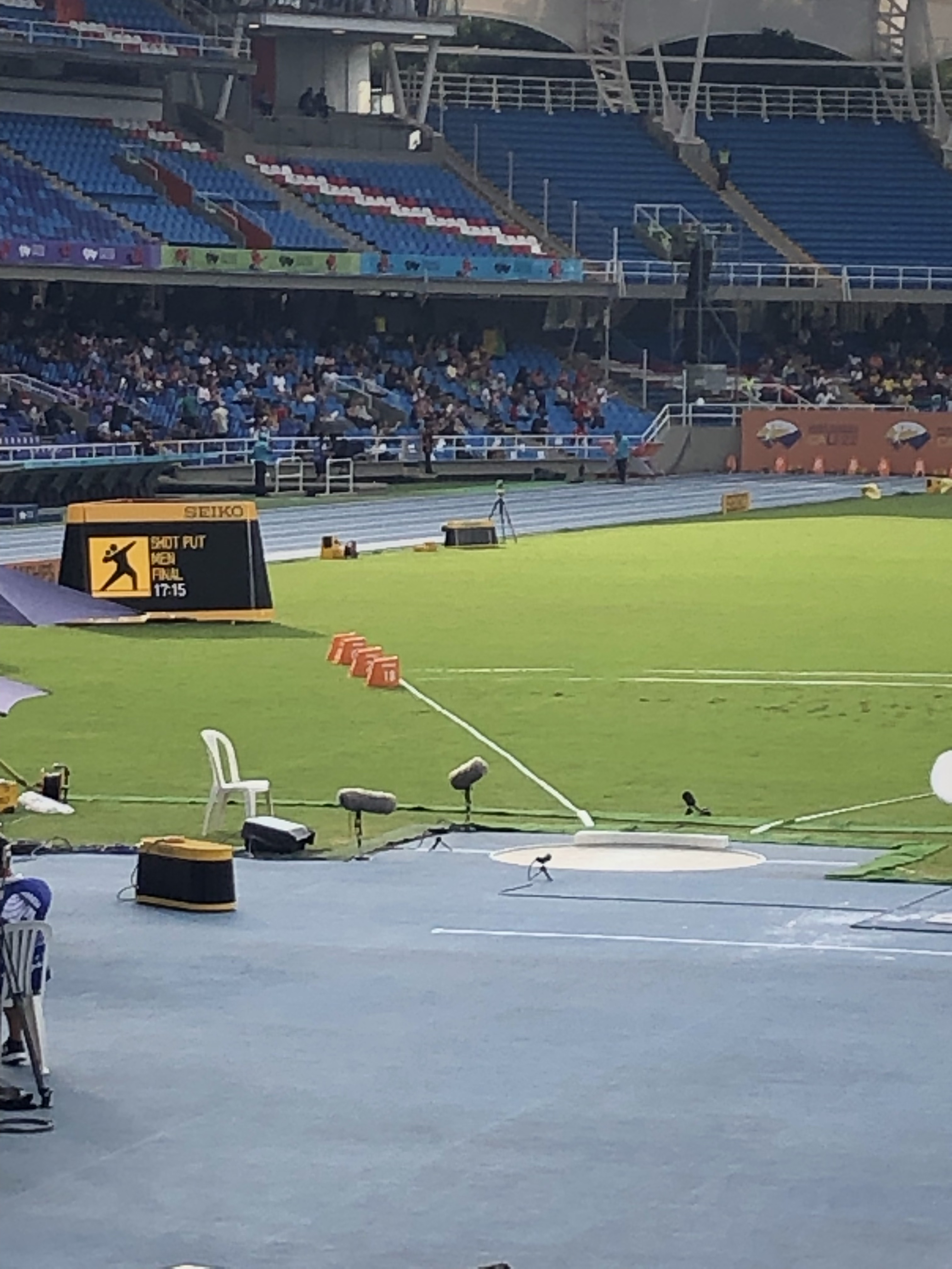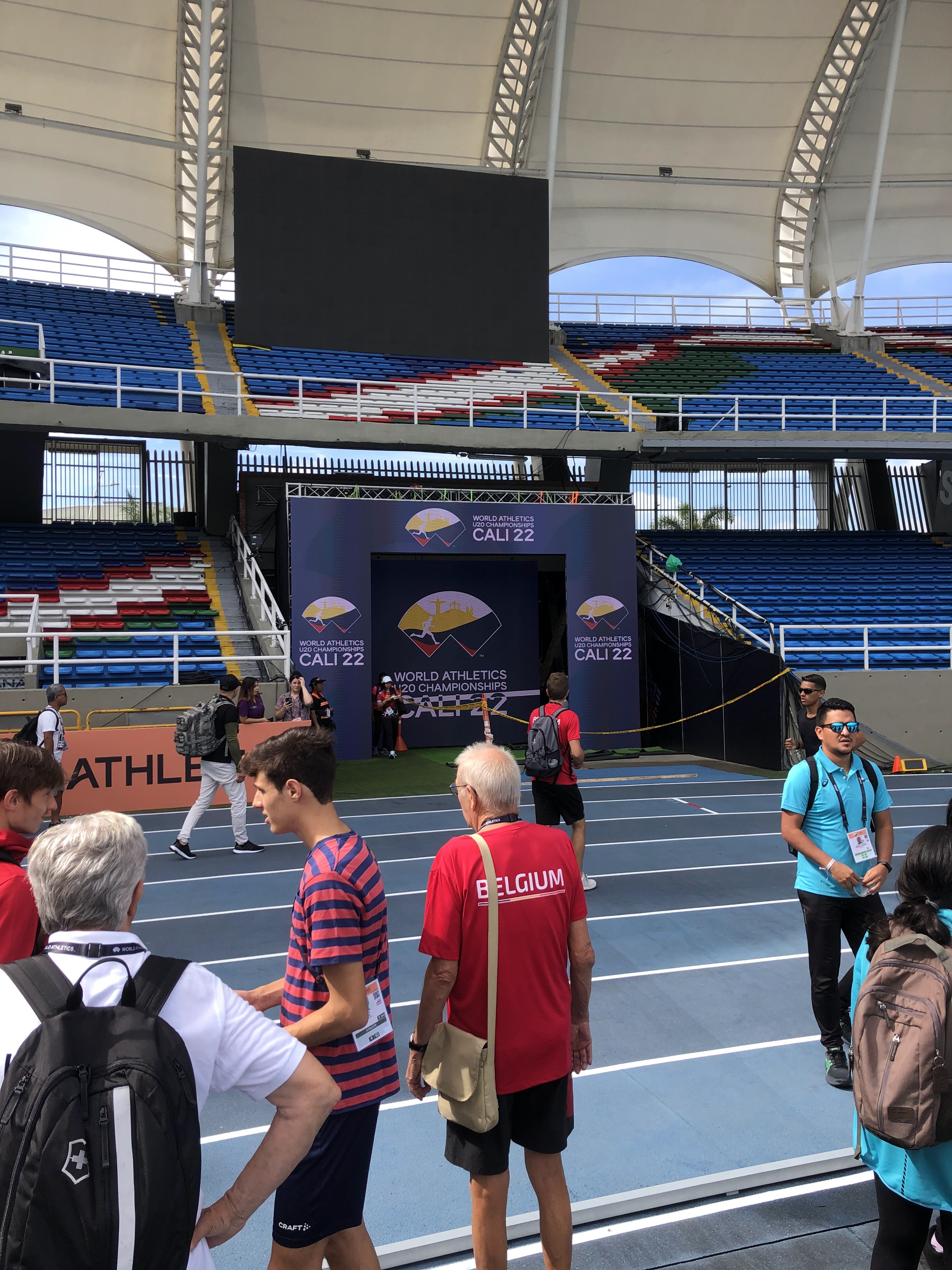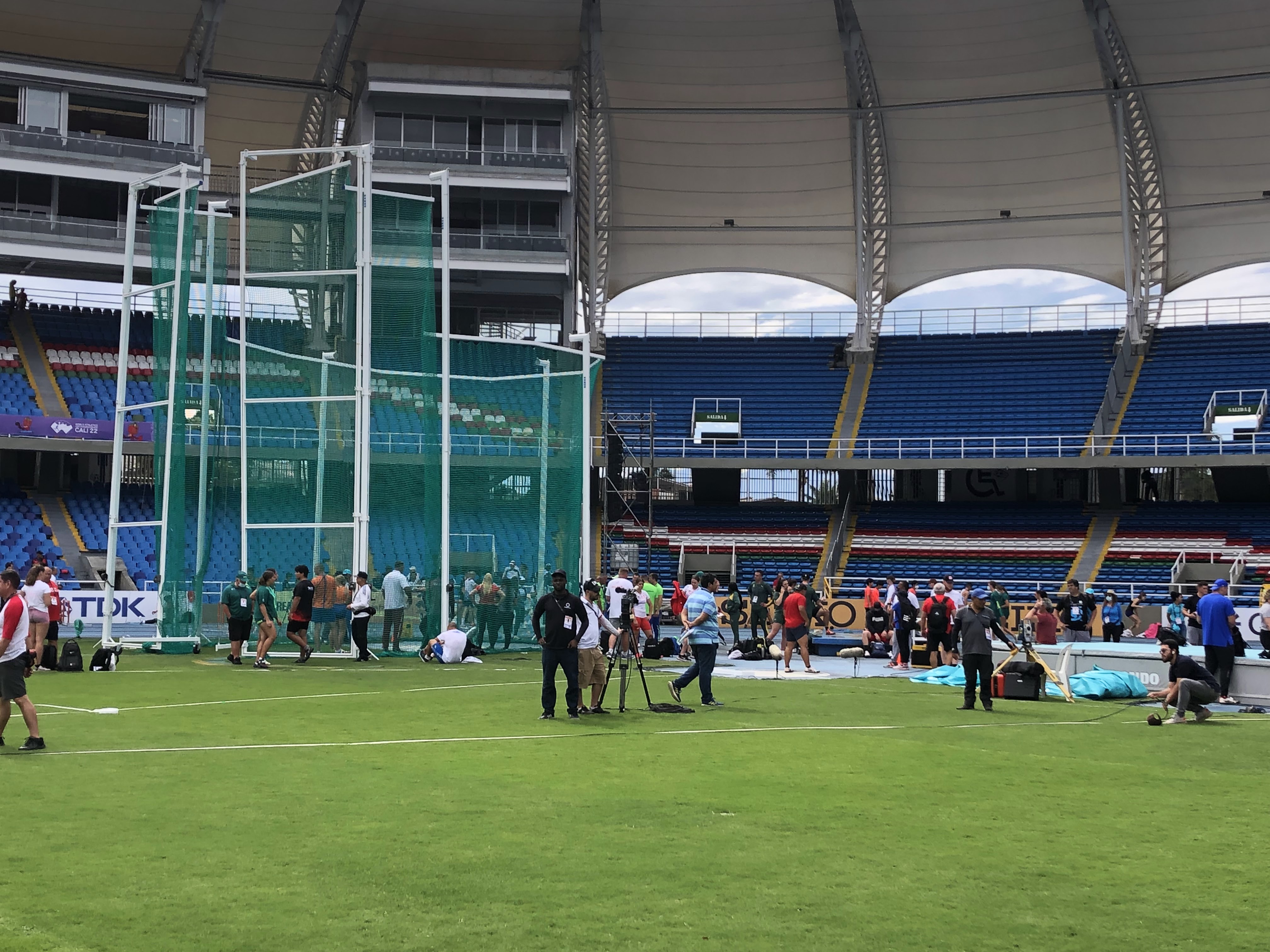 Alle delegaties kregen in de voormiddag de kans om het stadion te bezoeken en er een training af te werken. Voor de meeste loopnummers was dit geen overbodige luxe want op de opwarmingspiste lag er enkel asfalt. De “Mondo”matten stonden er nog mooi aan de kant op paletten en waren niet meer tijdig geplaatst kunnen worden… Dit gegeven zorgde dus voor een overrompeling. Hieronder kan u enkele sfeerbeelden bekijken. Andreas beperkte het vandaag tot het verkennen van de werpstanden en wat imitatieoefeningen.