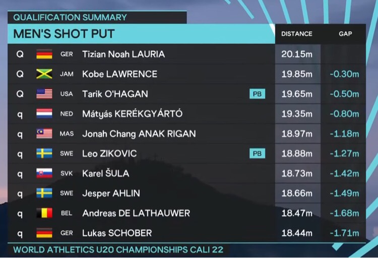 | Maandag 1 augustus – 17u38 | 00u38 | Kwalificatie kogel | 18m47 (9/28) |