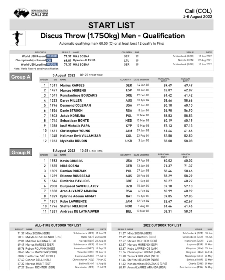 | Vrijdag 5 augustus – 10u25 | 17u25 | Kwalificatie discus | 51m01 (22/23) |