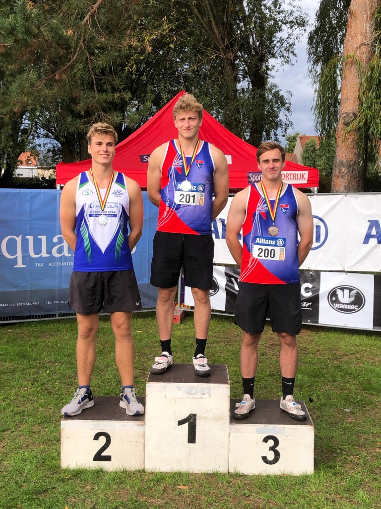Bij de junioren mannen zagen we eerstejaars Cédric Broeckaert en tweedejaars Andreas De Lathauwer het beste van zichzelf geven. Voor Cédric werd het geen vlekkeloze voorbereiding. Zo werd hij het afgelopen jaar afgeremd door blessures en kreeg hij het daarna op training mentaal wat moeilijk met als gevolg, wisselvallige prestaties. Andreas kreeg na zijn WKu20 wat rust en mocht daarna af en toe eens experimenteren met het gewicht, de hamer en de speer. Hij heeft immers zijn zinnen gezet op een werpvijfkamp die hij later op het seizoen nog wil afwerken in Tienen. Desalniettemin waren er voor beide heel wat verwachtingen en ook wel de hoop om minstens 1x samen op het podium te staan. De concurrentie was groot, heel groot. Om een idee te geven, in het discuswerpen kwamen er 5! jongens in actie die momenteel in de top 20 aller tijden staan. Ongezien! Eerst even naar het kogelstoten waar onze beide junioren onmiddellijk in de eerste poging uithaalden en uiteindelijk de eerste en tweede plaats niet meer zouden afgeven. Zo realiseerde Cédric een knappe 15m38 en Andreas een straffe 18m14, goed voor een kampioenschapsrecord. Cédric kon zich later nog verbeteren tot 15m80 en voor Andreas bleef het bij zijn openingsworp van 18m14. Doel geslaagd want samen op het podium met goud en zilver. Hun honger naar eremetaal was nog niet gestild want ook in het discuswerpen klommen ze samen op het podium. Hier haalde Andreas een mooie 53m28 en Cédric een degelijke 47m20. Best mooie afstanden gezien de moeilijke werpomstandigheden (felle meewind). Uiteindelijk werd het dit keer goud en brons voor onze “big boys”.