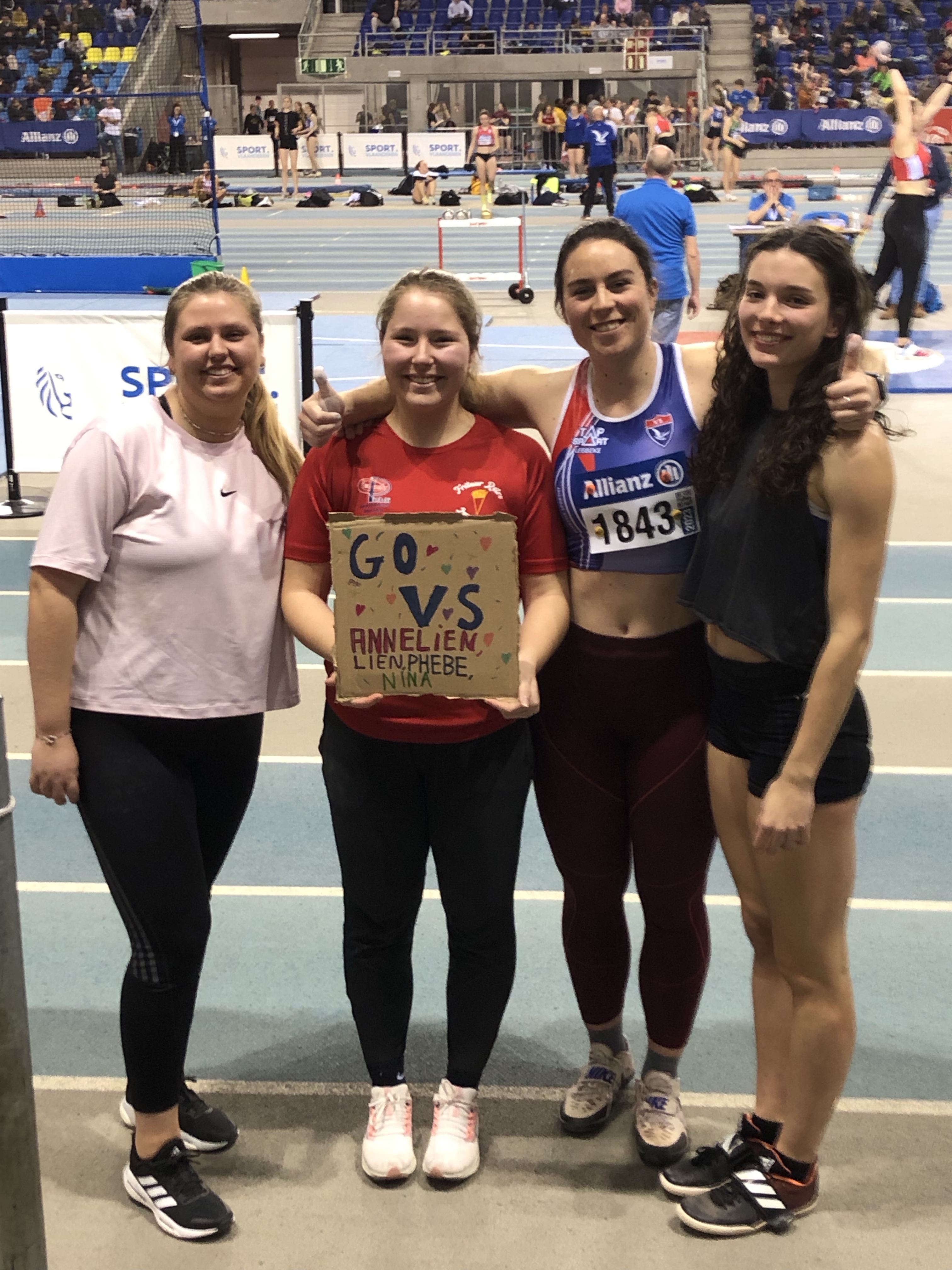 Na het mannelijk geweld mochten de vrouwen de ring onveilig maken. Daar zagen we opnieuw 4 van onze sterke werpsters in actie komen. Met Lien Rubbrecht, Nina Denolf, Annelien Beelaert & Phebe Vanderstraeten hadden we een diverse groep aan de start. Zo focuste Lien de laatste tijd vooral op de sprintnummers en het kogelstoten. Tijdens de wedstrijd kreeg ze nooit een goed gevoel bij haar worpen. Toch kwam ze tot een mooie 11m21. Meerkampster Nina heeft dan weer 7 nummers onder de knie te krijgen. Vandaag kwam ze met de kogel tot een degelijk 10m55 en kreeg ze de bevestiging dat er nog heel wat progressie mogelijk is. Annelien & Phebe zijn de echte werpsters van de groep met respectievelijk speer/discus en kogel/discus als specialiteit. Zij kwamen respectievelijk tot 10m26 en 10m24 en hadden wellicht op wat extra centimeters gehoopt. Outdoor zullen ze dit ongetwijfeld wel eens tonen!
