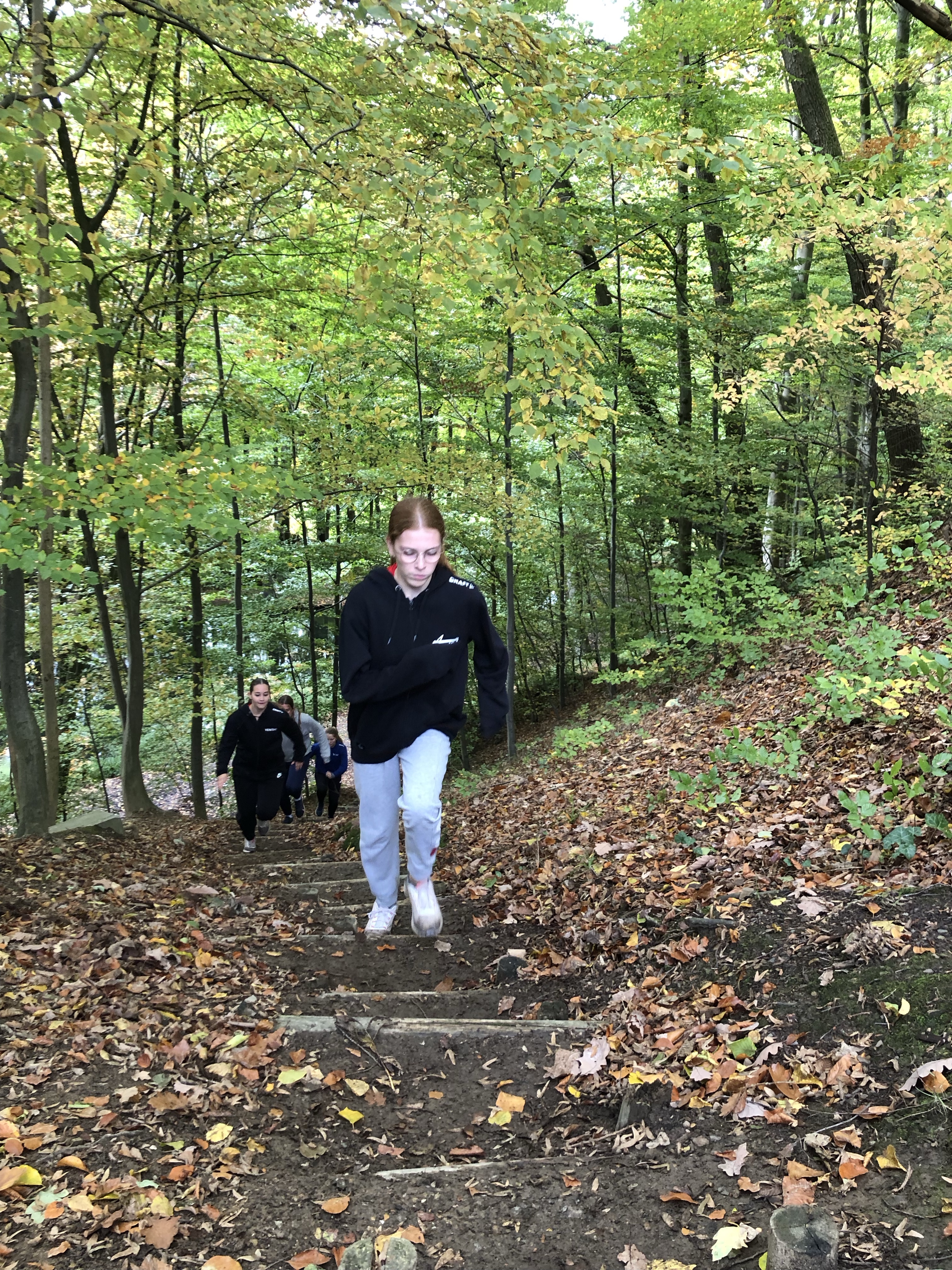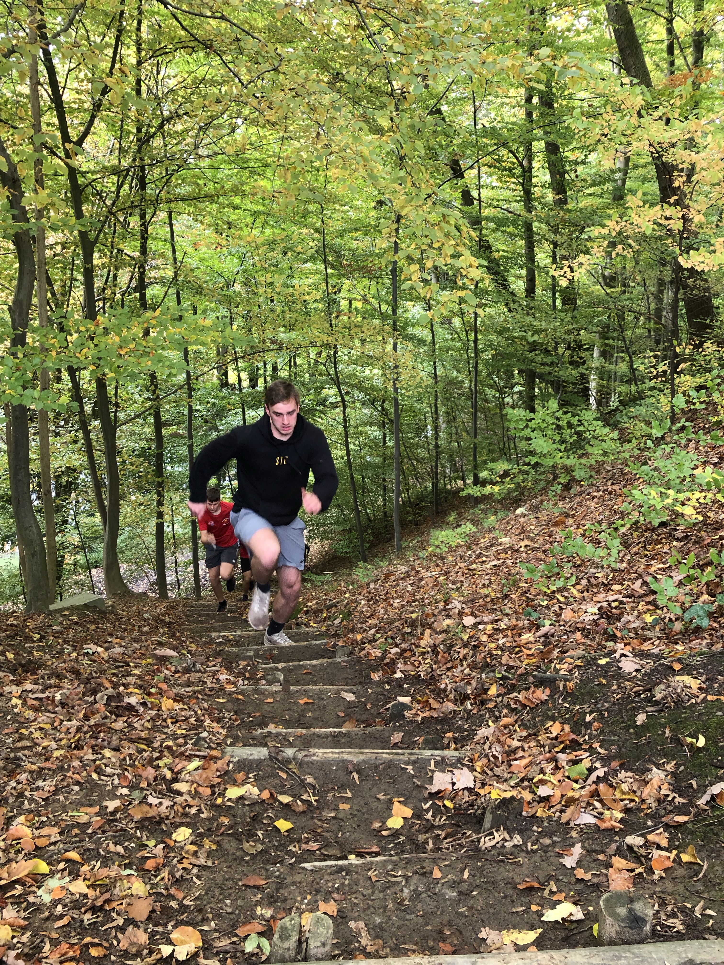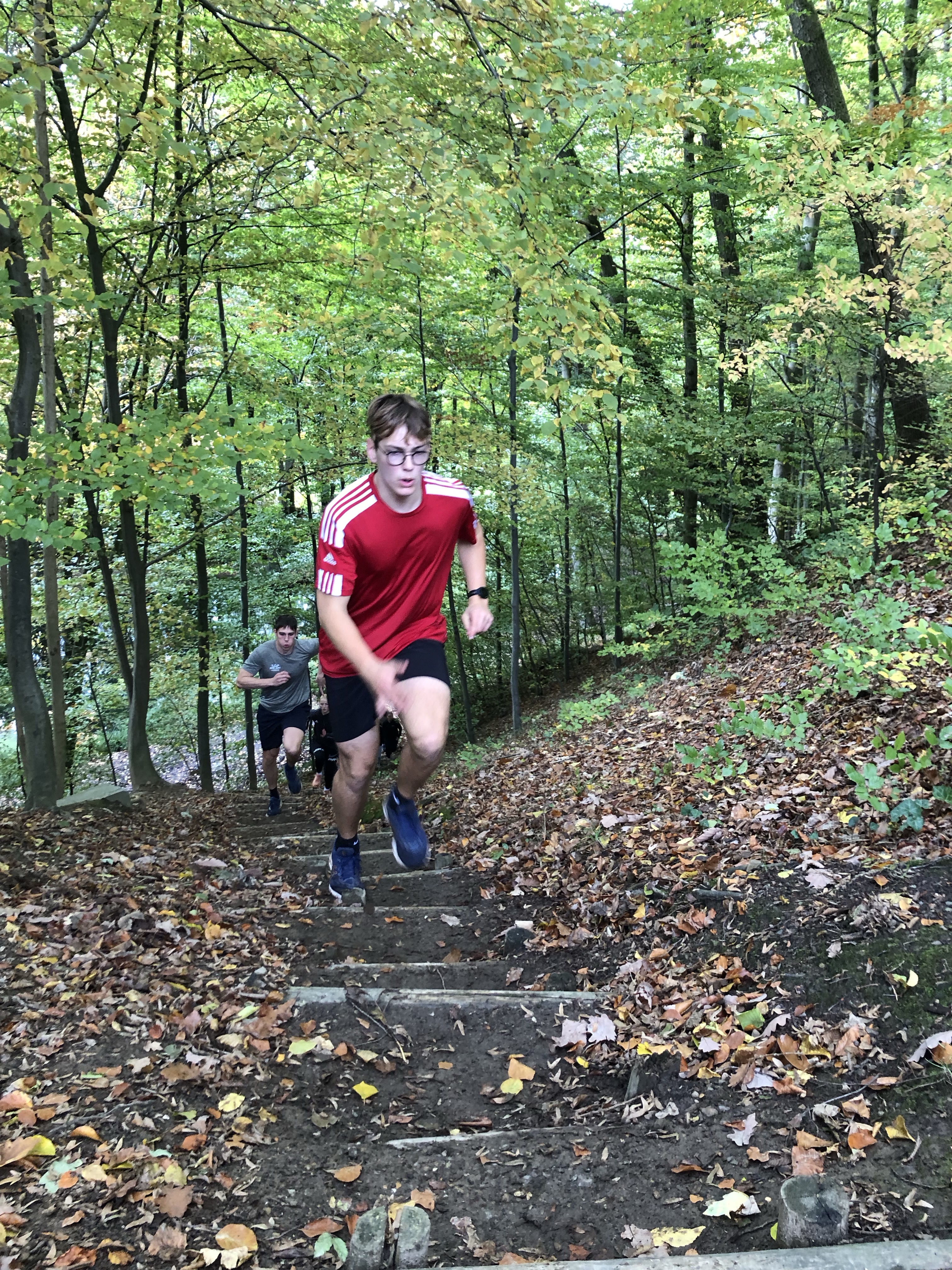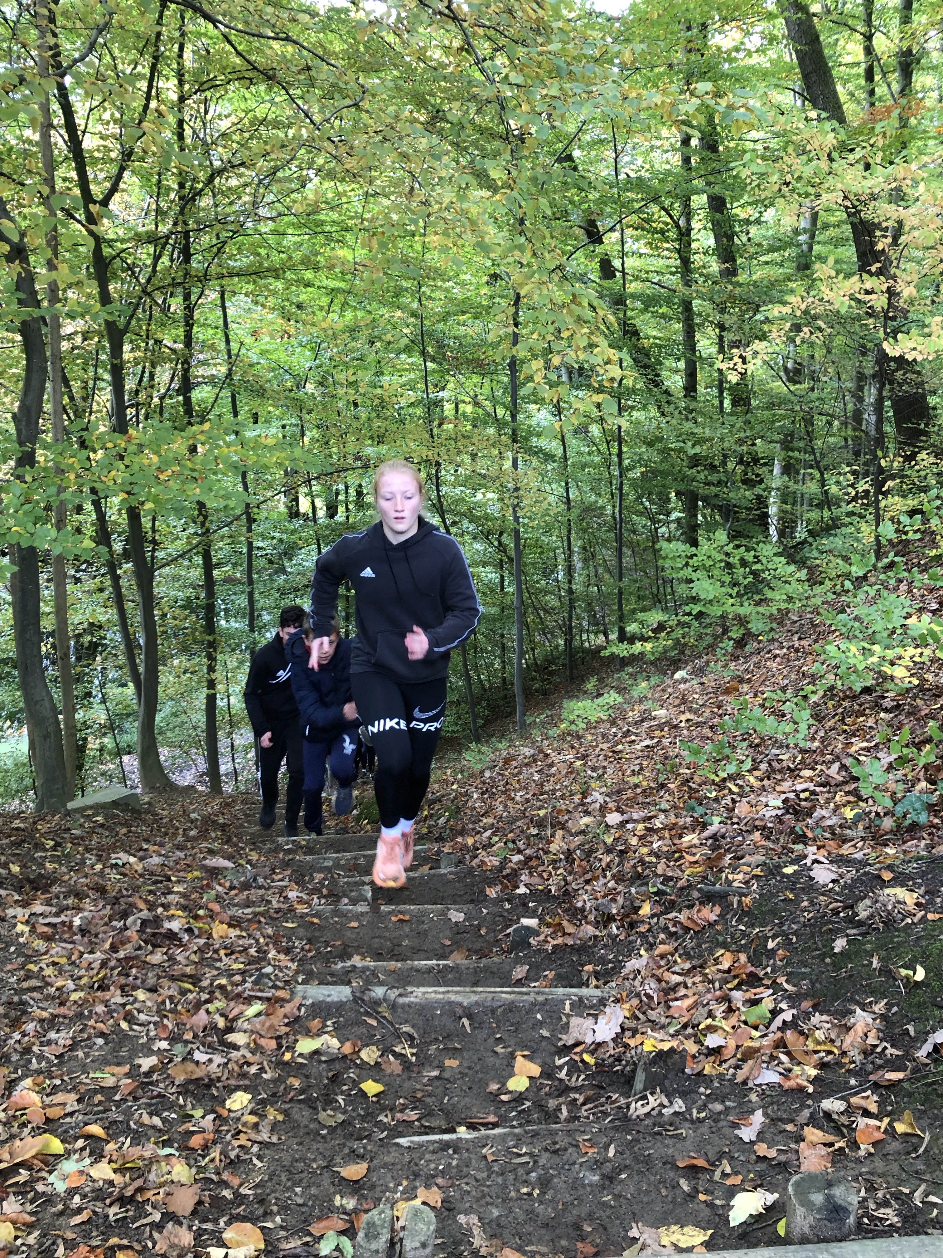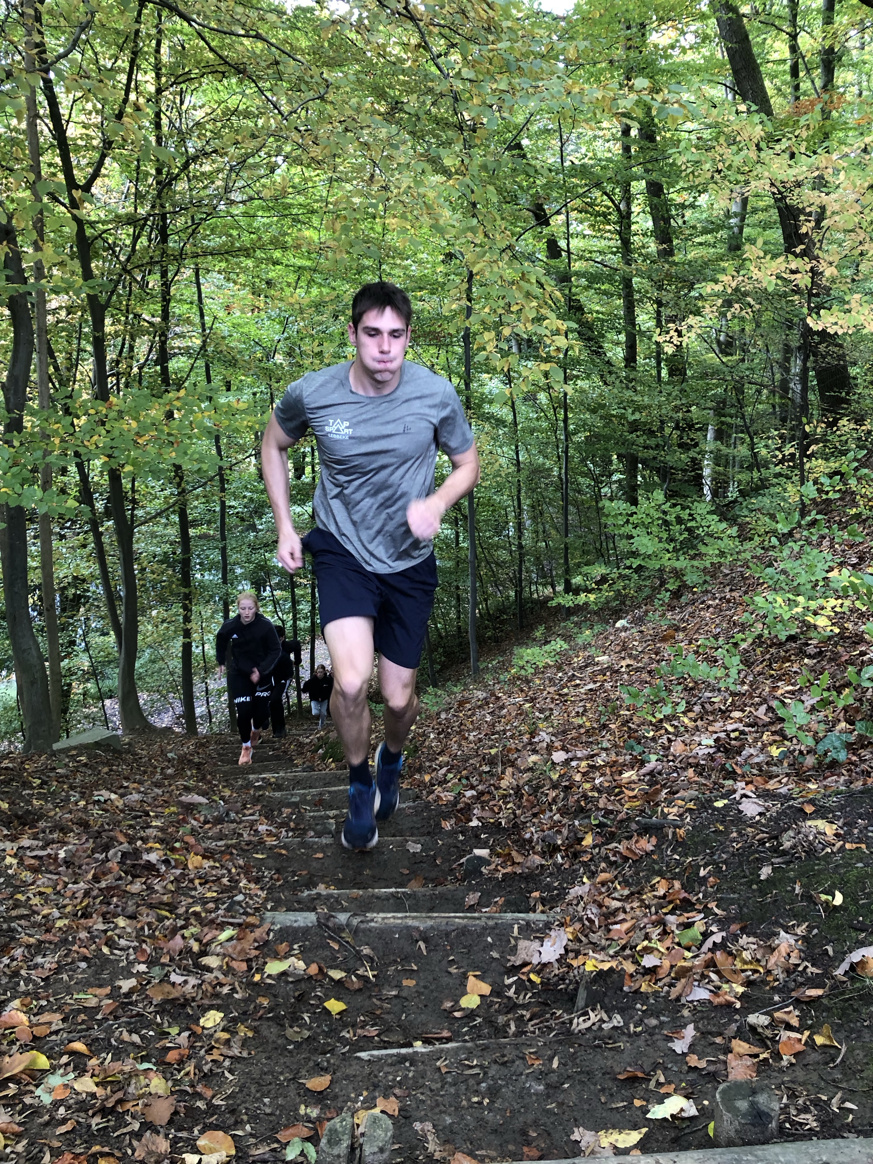 Op de laatste dag van onze herfststage ging de wekker bij de jongens zoals gewoonlijk om 7u50, Arnaud die begon zich ook zoals gewoonlijk klaar te maken om 7u63. Iedereen verzamelde aan het ontbijt om hun brandstof weer aan te vullen voor de laatste dag. Na het ontbijt moest onze kleinste speler (Leander) vroegtijdig vertrekken wegens een pumpdefect, hierdoor accepteerde hij dat er een kans was om nog een klein pumpje te missen. Het verschil moet er zijn, dat bleek maar weer al eens. Omdat de weergoden vandaag niet aan onze kant stonden, besloten we eerst onze buiten activiteit die in de namiddag gepland stond, te doen. We deden wat loop/coördinatie gerichte oefeningen. Daarna vertrokken we naar de o zo bevreesde trappen. Deze gingen best vlot bij iedereen, Lukas dacht zelf bijna 2 keer naar beneden te glijden i.p.v. te lopen omdat hij het te makkelijk vond. Bij het uitlopen besloten Cé en Andre de gains te verspillen en 5km te lopen. Daarna vertrokken we naar het laatste etentje en werden we aardig verrast door schnitzels op een bedje van tsaaaa.