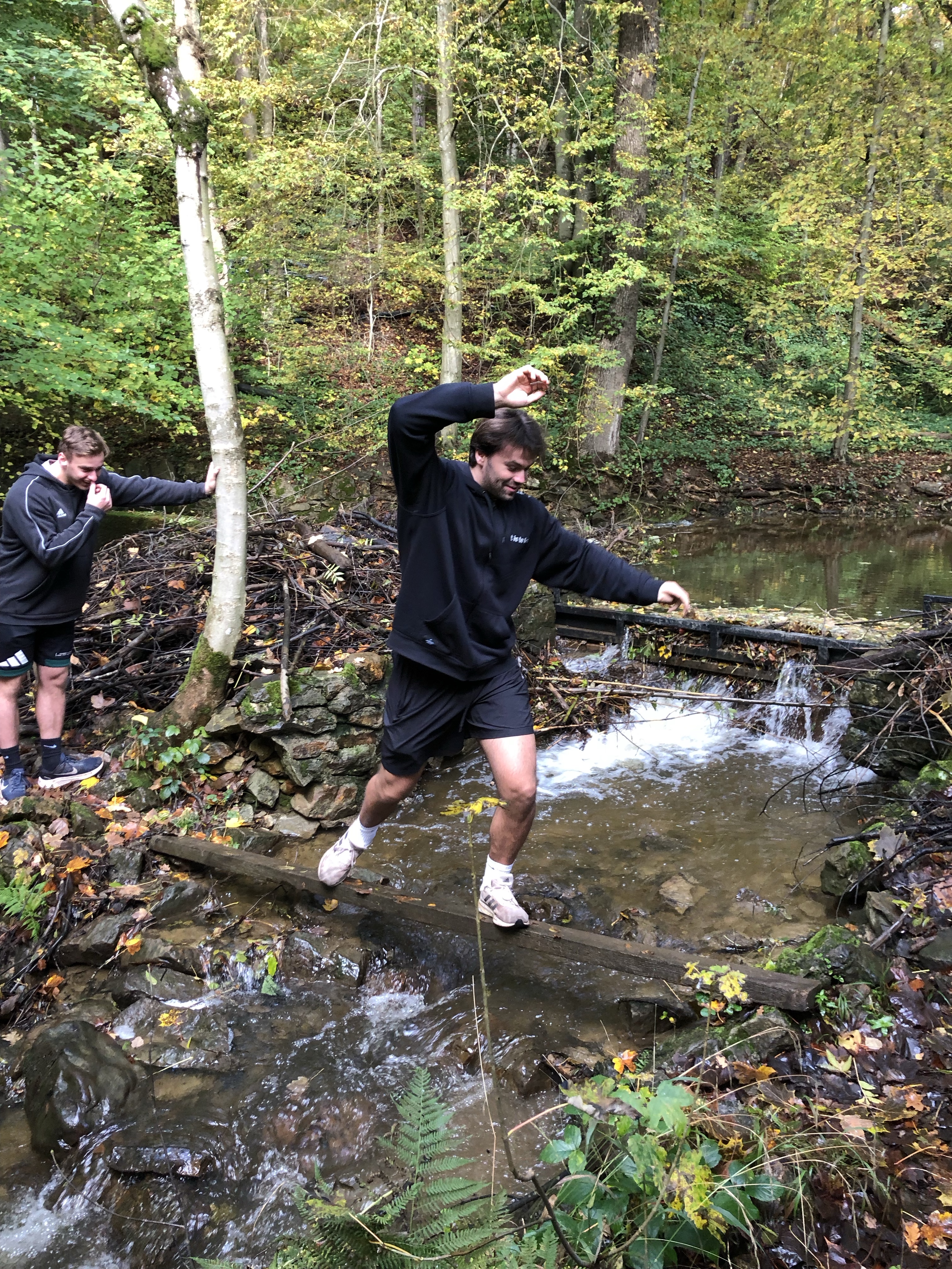 Na aankomst om 10 uur begonnen we aan de verkenning van het terrein. Dit deden we aan de hand van een rondje rond het “Lac de Warfaaz”. Na de verkenning aten we onze buikjes rond om ons voor te bereiden voor de zware training in de namiddag. Na wat rust vertrokken we richting het bos voor een pittige training. Het eerste deel van deze training was de helse bergbeklimming naar de trainingslocatie. Eens we boven waren begonnen we aan onze sprongtraining. Op het einde van deze training deden we nog wat discusworpjes, hiervoor gebruikten we takken. Daarna was het (hoog)tijd om ons te wassen. Vervolgens trokken we naar het restaurant om onze buikjes te vullen met spaghetti. Als avondactiviteit had trainer Filip een quiz voorbereid. Deze werd terecht gewonnen door: Inge, Fons, Yenthe, Annelies, Annelien en Andreas, alias “Safety First”. Toen kropen we in onze bedjes en droomden we van de volgende dag.