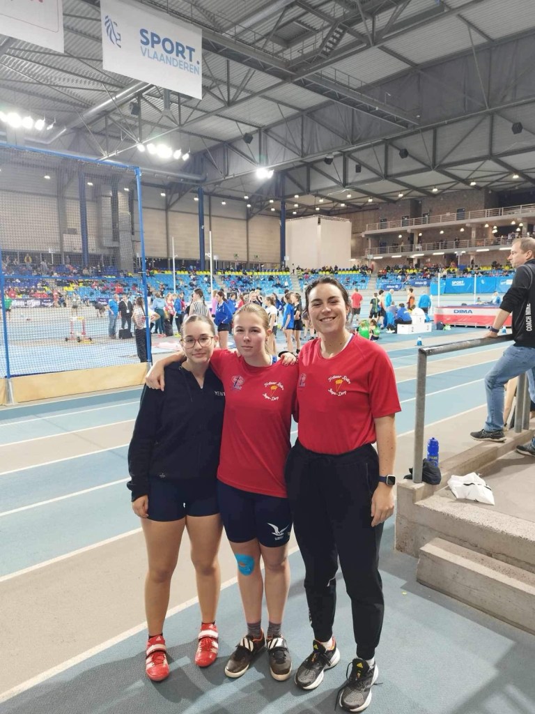 De volgende meiden in de ring waren eerstejaars scholier Yenthe Vereecken en tweedejaars Loes De Meyer. Zij begonnen aan hun wedstrijd met bijna een uur vertraging en moesten deze samen afwerken met de cadetten, wat voor 39! deelnemers zorgde. Omstandigheden waar je niets kan aan doen, daar moet je u dan ook niet druk in maken als atleet want dat is verloren energie. En dus spaarden onze twee meiden hun krachten om die 3kg wegende kogel zo ver mogelijk weg te kunnen stoten. Yenthe stootte opnieuw voorbij de 7m, al was het deze keer wel heel erg nipt met 7m01. Loes kwam maar moeilijk op gang. Ze vond pas laat in de wedstrijd het goede ritme en liet uiteindelijk met 10m67 een knap nieuw indoor PR opmeten.