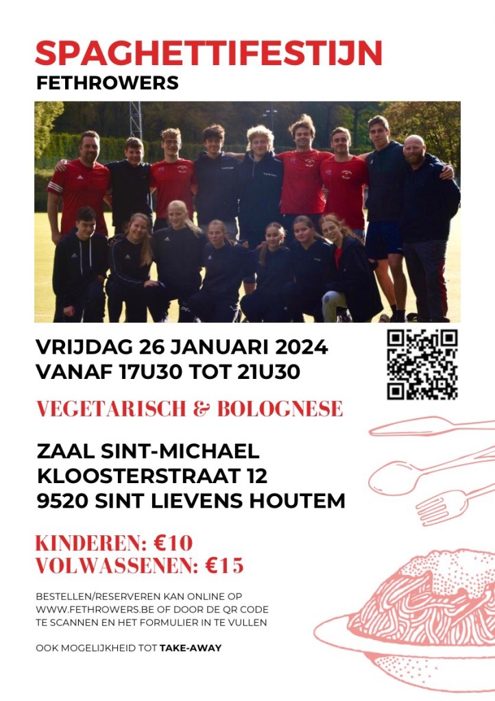 Graag maken we langs deze weg ook nog wat reclame voor ons 10de spaghettifestijn. We verwelkomen u heel graag op vrijdag 26 januari 2024 in de zeer ruime zaal “Sint Michaël” te Sint-Lievens-Houtem (Kloosterstraat 12). Kaarten zijn nog steeds te verkrijgen bij alle FEThrowers voor slechts 15 euro (kinderen onder de 10 jaar betalen 10 euro). Online inschrijven kan ook en gaat heel makkelijk en snel door op deze link te klikken en het bijhorend formulier in te vullen.