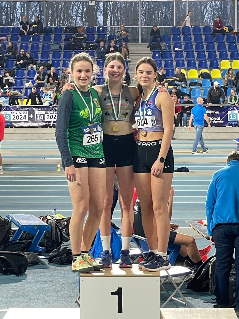 Volgende atletes in actie waren seniore Lien Rubbrecht en juniores Inge Eeckhout en Emma De Landsheere. Voor onze beide juniores waren er medaillekansen, met 2 op het podium was zelfs mogelijk. Eerstejaars Inge wist zich met 9m23 te verzekeren van een 3de plaats. Zeer mooie beloning voor al haar inzet. Emma kwam als tweedejaars tot een knappe 10m87. Niet slecht, met de beperkte trainingen die ze deze winter kon afwerken. Het werd daarna tot de laatste poging nagelbijten voor haar. Door het minder presteren van de topfavoriete werd het pas in de laatste poging duidelijk dat ze zowaar met de Provinciale titel huiswaarts kon.