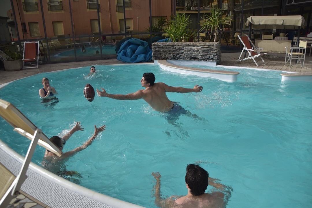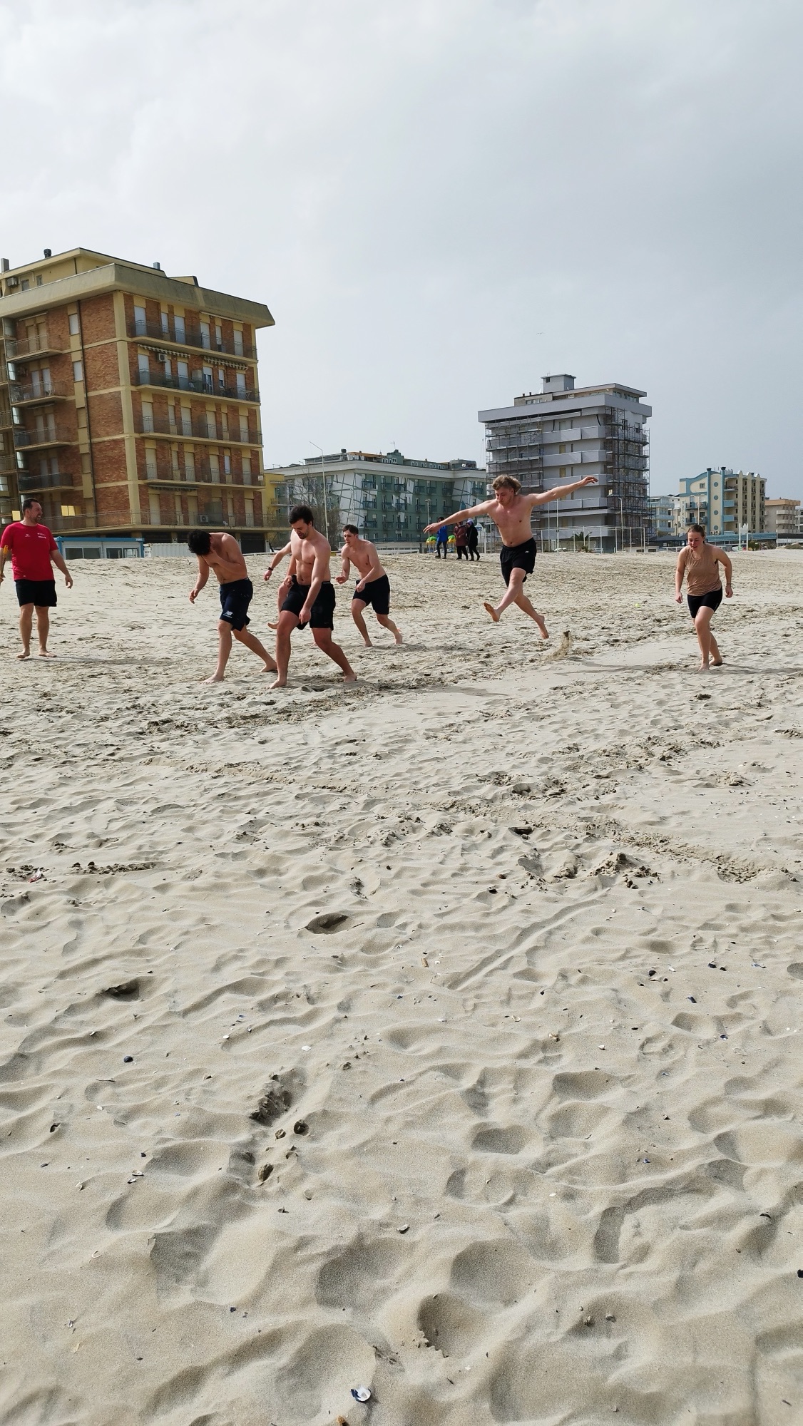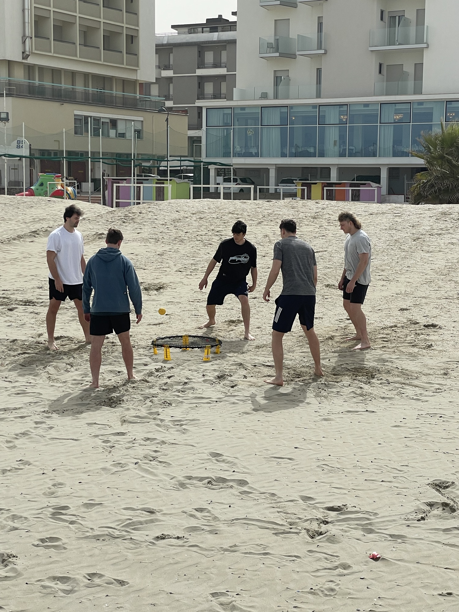 Na ons eten pakten we even rust en gingen daarna naar het strand voor onze traditionele strandtraining. De zee zat veel dichter dan vorige jaren maar plaats hadden we genoeg. De opwarming hebben we leuk gemaakt door wat met de rugbybal te gooien en een klein spike-ball toernooitje te maken. De waarheid moet gezegd worden, Arnaud en Leander hebben de andere jongens afgemaakt. Na de benen en de core wat vermoeid te maken, namen we een stevig koude duik in de zee, en daarna in het zwembad van het hotel. Geslaagde eerste dag!