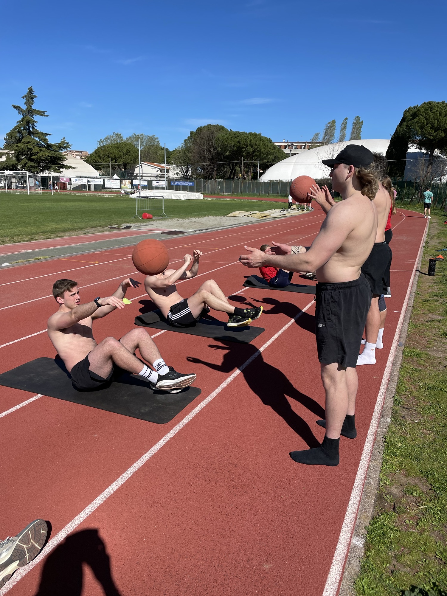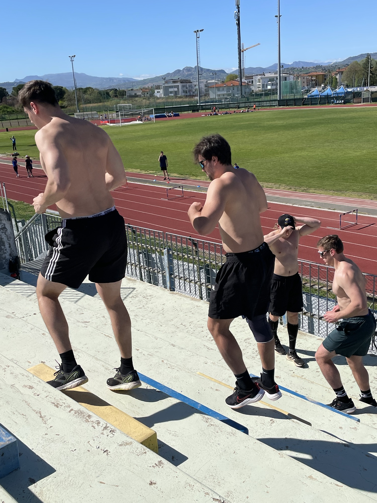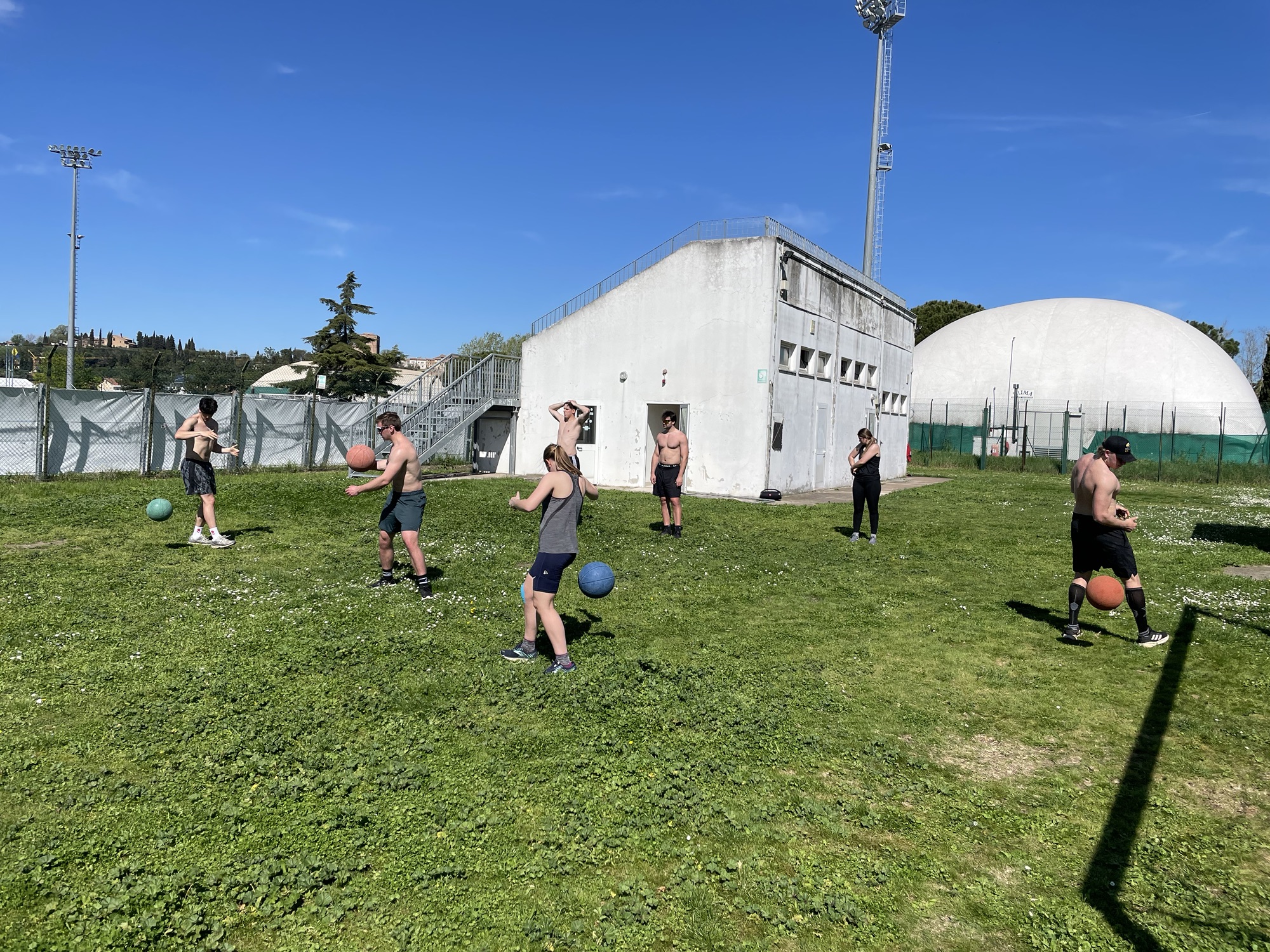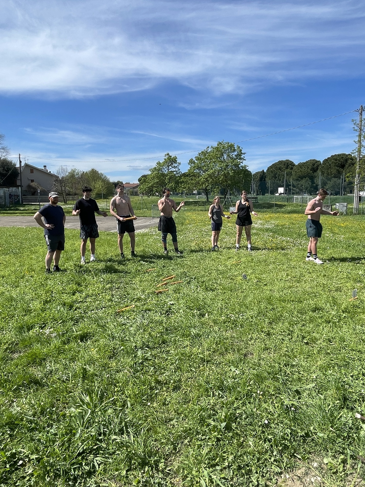 Vandaag stonden we allemaal met stijve spieren op. Gelukkig konden we ons in de voormiddag wat losmaken onder de stralende zon door wat ladder- en snelheidswerk. Hierna mochten we nog enkele schijven lanceren richting de maan omdat onze discustraining gisteren werd verkort door onverwachte regen. Na de middag hadden we kogel op de planning, we werden vergezeld door een Duitse collega (die juust André zou hitten 👀). Na wat imitaties onder oog van Filipi kregen we de toestemming om ons te gaan testen 💉op de lokale ring. Bezweet en voldaan keerden we terug naar ons hotel waar we eerst gingen genieten van ‘de lokale delicatesse’ (jammer genoeg niet de dames): gelato. Na een frisse duik om de spieren te relaxeren aten we ons vol (André nog voller dan die al was) en sloten we de avond in gezelligheid af. Ciao!