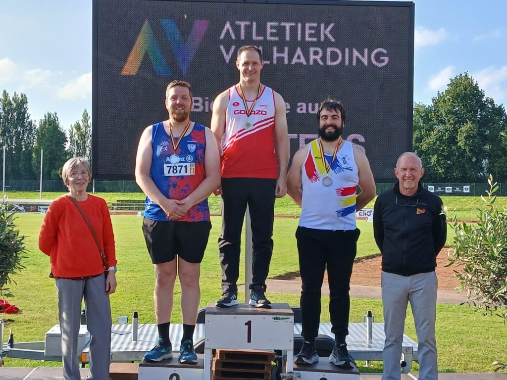 Filip (M45) begon in het discuswerpen met 42m19, goed voor een 2de plaats. Best een mooie afstand die pas in de allerlaatste poging nog voorbijgegaan werd… Met de kogel stootte hij alle frustraties van zich af met worpen van 14m96, 14m98 en als beste 14m99. Hier haalde hij wel de Belgische titel binnen en benaderde zelfs het Belgische record tot op 9 cm (15m08 van Claude Chevalier in 1986).