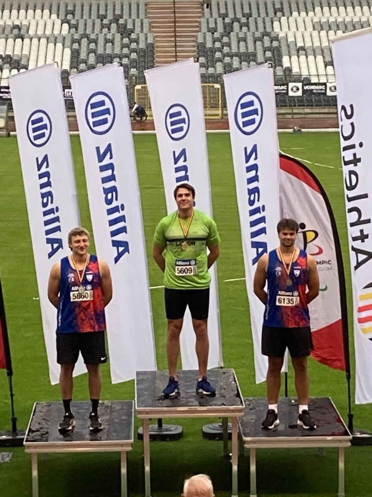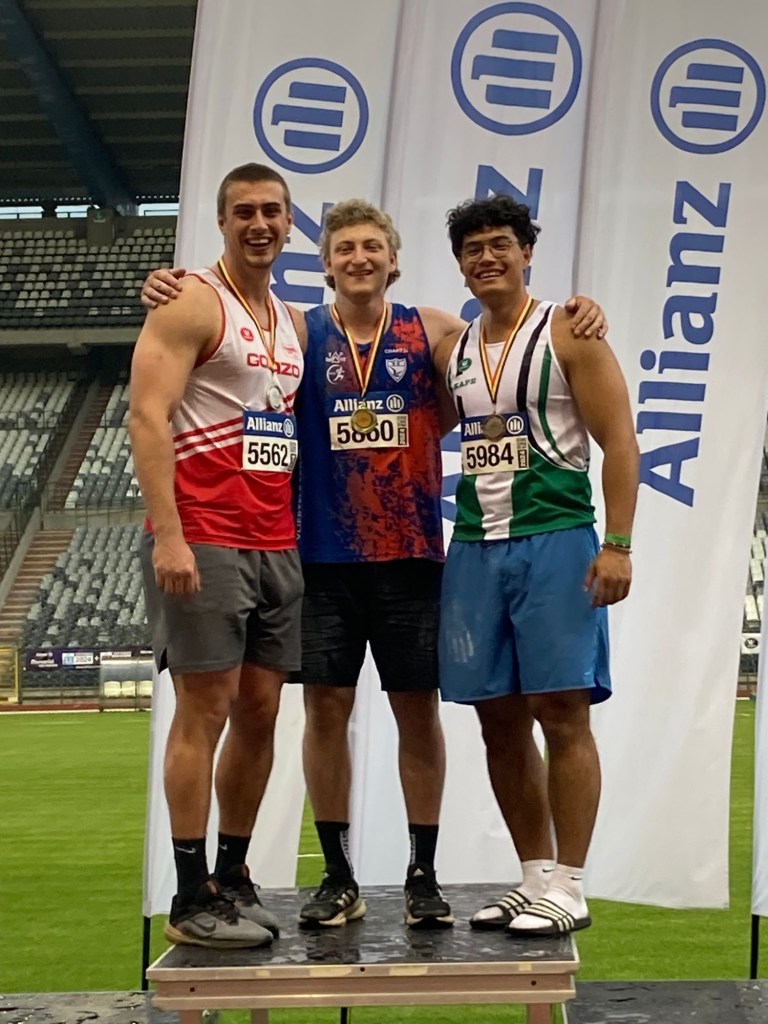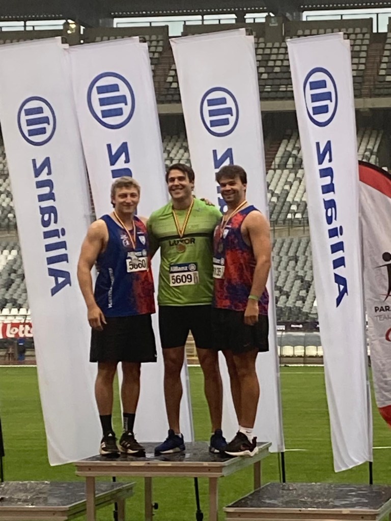 Ondertussen zijn we aangekomen bij een twee unieke prestaties. Tweedejaars belofte Andreas De Lathauwer begon niet zo best aan zijn wedstrijd. Gelukkig groeide hij worp na worp en kon hij in de allerlaatste poging nog uitpakken met 51m48. Op dat moment goed voor een 2de plaats maar er moesten nog enkele klepper aan de beurt komen. Zo ook jarige Leander Casteels die er al een heel regelmatige wedstrijd had opzitten, met worpen tussen de 49 en 50m. Maar wat er in de laatste poging nog gebeurde mag best straf genoemd worden… hij knalde zijn discus naar een seizoensbeste van 51m27, net iets minder dan zijn trainingsmaat! Op dat moment stonden ze dus respectievelijk op 2 & 3 met nog 3 werpers die de na beurt hadden. Enkel Philip Milanov, de onbedreigde Belgisch kampioen, wierp nog verder en zo was dus zilver en brons voor een FEThrower.