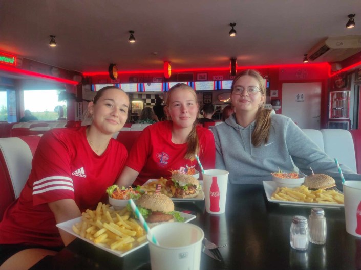 Eerstejaars scholiere Yenthe opende de wedstrijd met een mooie 8m47. Voor tweedejaars scholiere Loes was het wat aftasten met de gladde ring maar uiteindelijk legde ze wat goeie afstanden af en eindigde ze met 11m71. Als laatste aan de beurt was eerstejaars juniore Inge. Inge liet een mooie 9m71 opmeten. Een mooi resultaat, ondanks haar drukke agenda en niet veel trainingen. Per traditie sloten we af met een lekker hamburger in route 46. 🙂