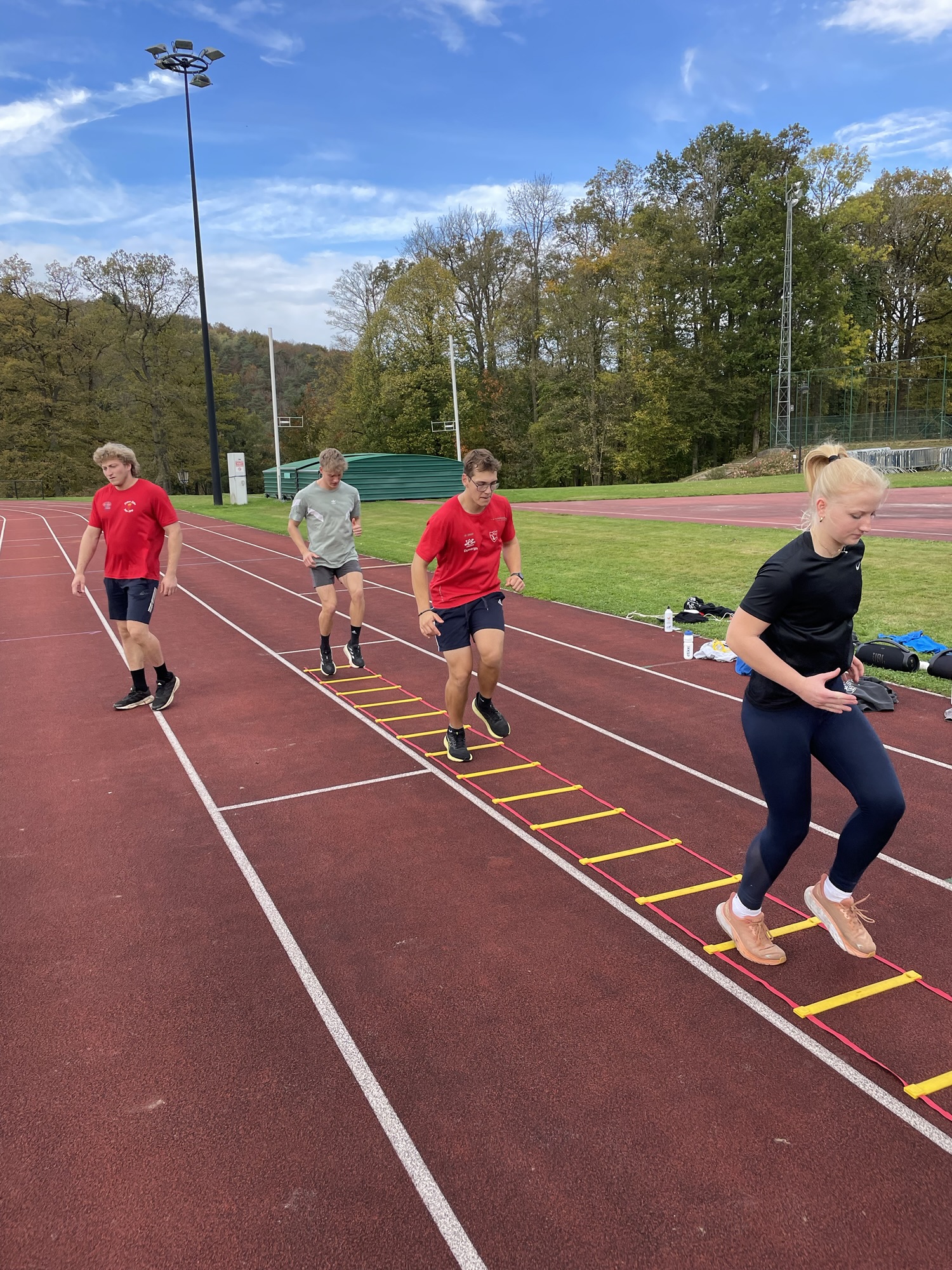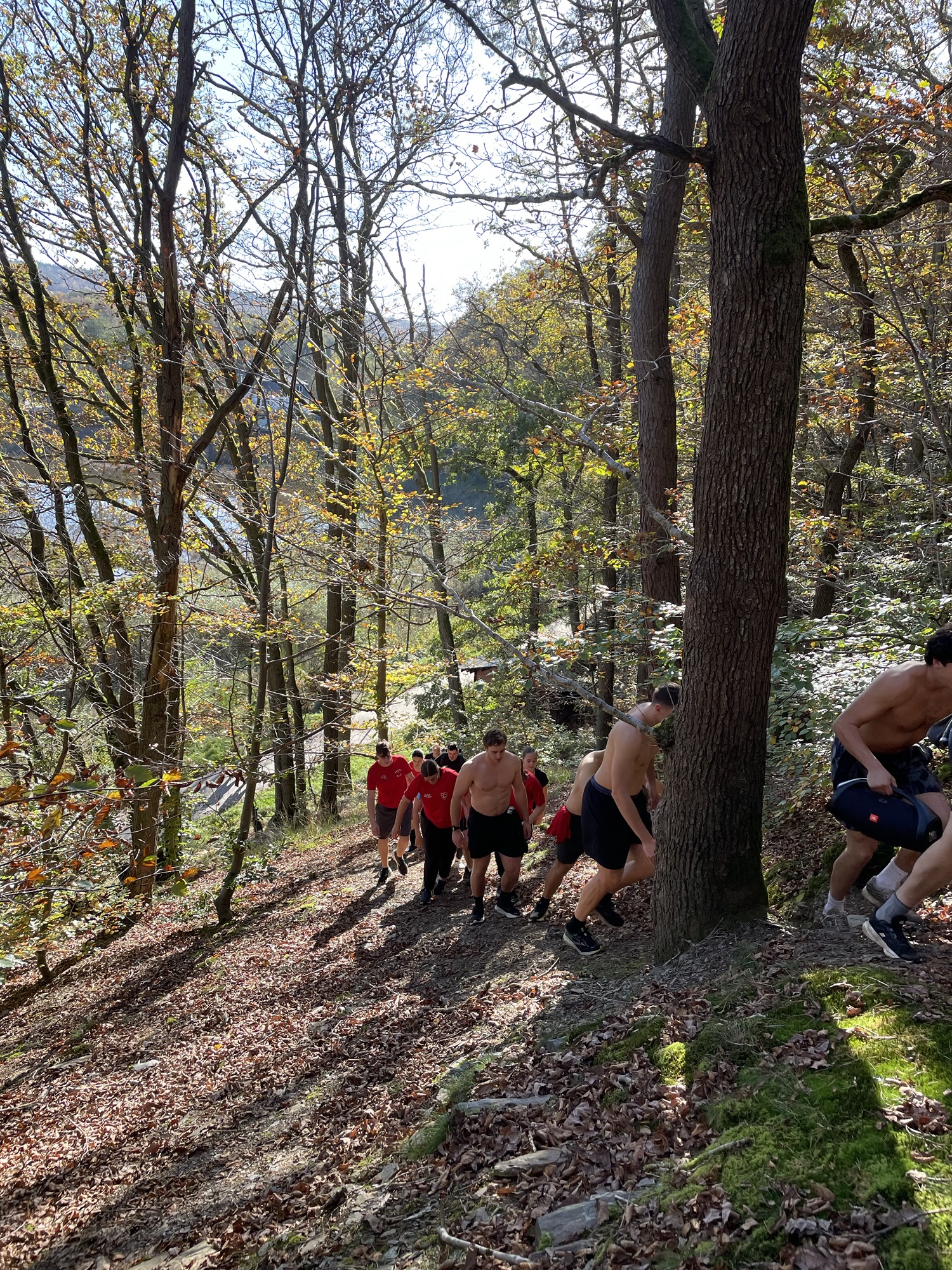 Daarna was het tijd voor het echte werk en begonnen we aan een stevige training rompstabilisatie met medecineballen. Na de training was het dan alweer tijd om te gaan eten. Met onze groep grote eters aten we alles op wat er aanwezig was, alleen zo konden we ons goed voorbereiden op de volgende training. Een training met snelheid, coördinatie en tenslotte trappen lopen waar het voor velen wat lastig werd, grapje grapje, stapje stapje, Cé geraakte niet meer op het trapje. Als afsluiter gingen we met zen allen nog naar de Burger King.