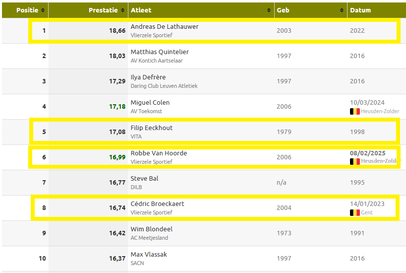 Deze straffe prestatie is goed voor de 6de plaats allertijden bij de juniors in België. Bovenstaande figuur toont aan dat hij in goed gezelschap staat 😉 .