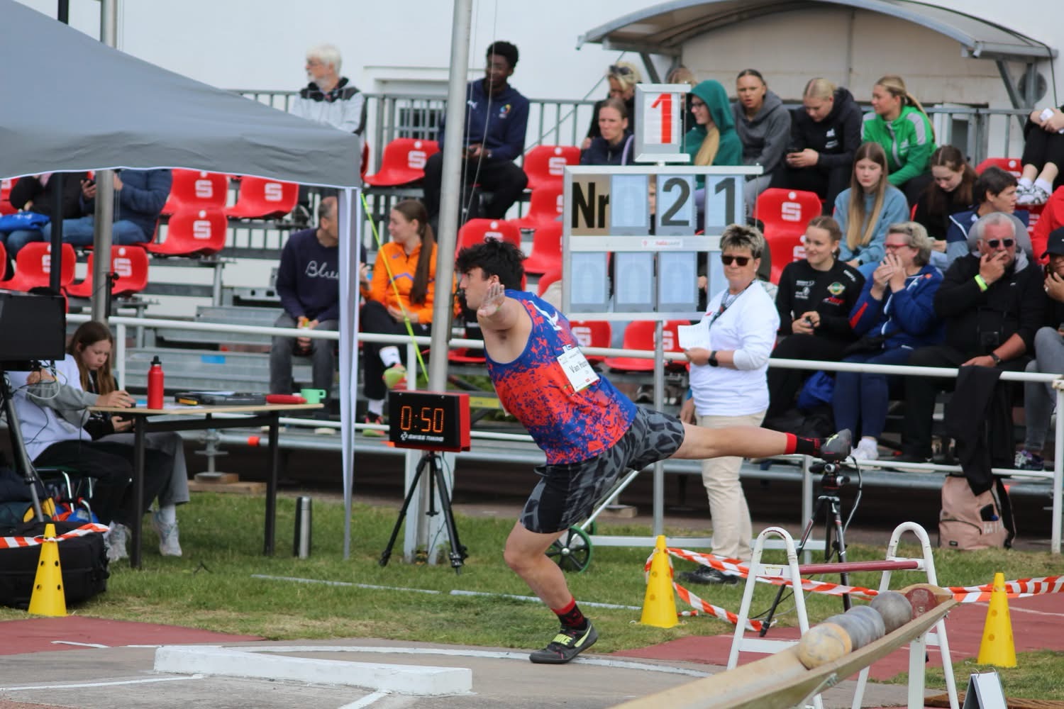 Op de laatste competitiedag traden Cédric en Andreas in actie. In tegenstelling tot de dag ervoor viel het weer tegen en ging het kogelstoten van start in een regenbui. Desondanks de omstandigheden werkten beide een regelmatige wedstrijd af. Cédric kon 6 worpen bemachtigen en een afstand van 15m92 goed voor een 6de plaats. Andreas stond een tijdje aan de leiding in de competitie maar moest deze in de voorlaatste worp afgeven. Hij werd 2de met een worp van 18m28, exact de limiet voor het EKu23 in Bergen, Noorwegen. Na het kogel werd er een kleine sprint getrokken naar het discuswerpen. Hier ging de wedstrijd bijna van start, gelukkig liet de organisatie nog enkele inworpen toe. Er werd terug in de regen gegooid. Cédric moest het doen met 3 worpen maar wel met een acceptabele 47m37. Andreas mocht 6 worpen zwieren en kon tot 2x een verste van 52m17 neerzetten. Er werden ook nog veel andere mooie prestatie geleverd door Belgische atleten, onder andere een Belgisch record van Devlin in het hamerslingeren. Proficiat aan allen!