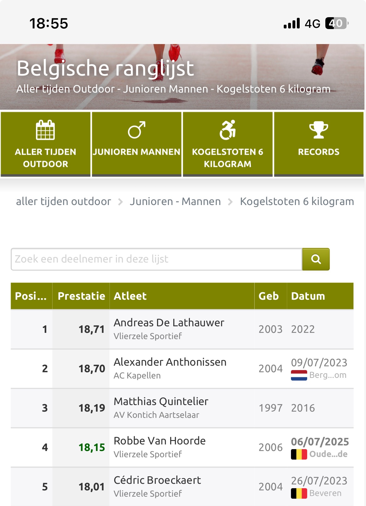 Junior Robbe Van Hoorde is de laatste weken écht on fire. Drie dagen nadat hij in Beveren met 17m83 de internationale limiet voor het EK U20 had gestoten, deed hij er vandaag in Oudenaarde (06/07) nog een schepje bovenop. In Beveren had hij al een nipte nulworp (te lange tenen, remember?) van 18m14, maar vandaag nam hij alle twijfels weg en liet hij eindelijk een geldige +18m-stoot opmeten. Met 18m15 vestigde hij niet alleen de Belgische limiet, maar komt hij ook op de vierde plaats aller tijden. In mooi gezelschap, want in die top vijf staan ook clubgenoten Andreas De Lathauwer en Cédric Broeckaert. Drie FEThrowers over de 18 meter met de 6K-kogel: wat een straffe statistiek! Robbe stootte vandaag onder andere 17m89, 17m94 en 18m15, liefst drie keer boven zijn PR van vorige donderdag. Sterk werk, Robbe!