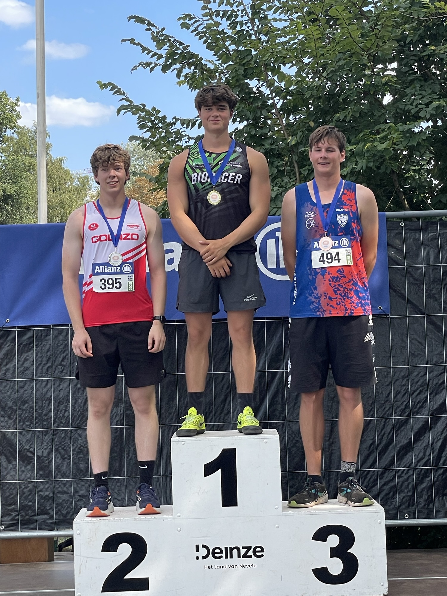 Kort na de middag was het de beurt aan eerstejaars scholier Lowie De Meyer. Vorig jaar nog dubbel Vlaams kampioen bij de cadetten, presteerde hij opnieuw sterk. Met de discus vestigde hij een nieuw PR van 40m64, goed voor plaats vijf. In het kogelstoten begon hij met twee ongeldige worpen, maar zette in zijn derde poging orde op zaken. Een mega verre worp werd daarna nog afgekeurd omdat hij met zijn hiel de rand van de stootbalk raakte, maar hij stootte vervolgens alsnog 14m88, goed voor brons en de tweede medaille van de dag voor ons team.