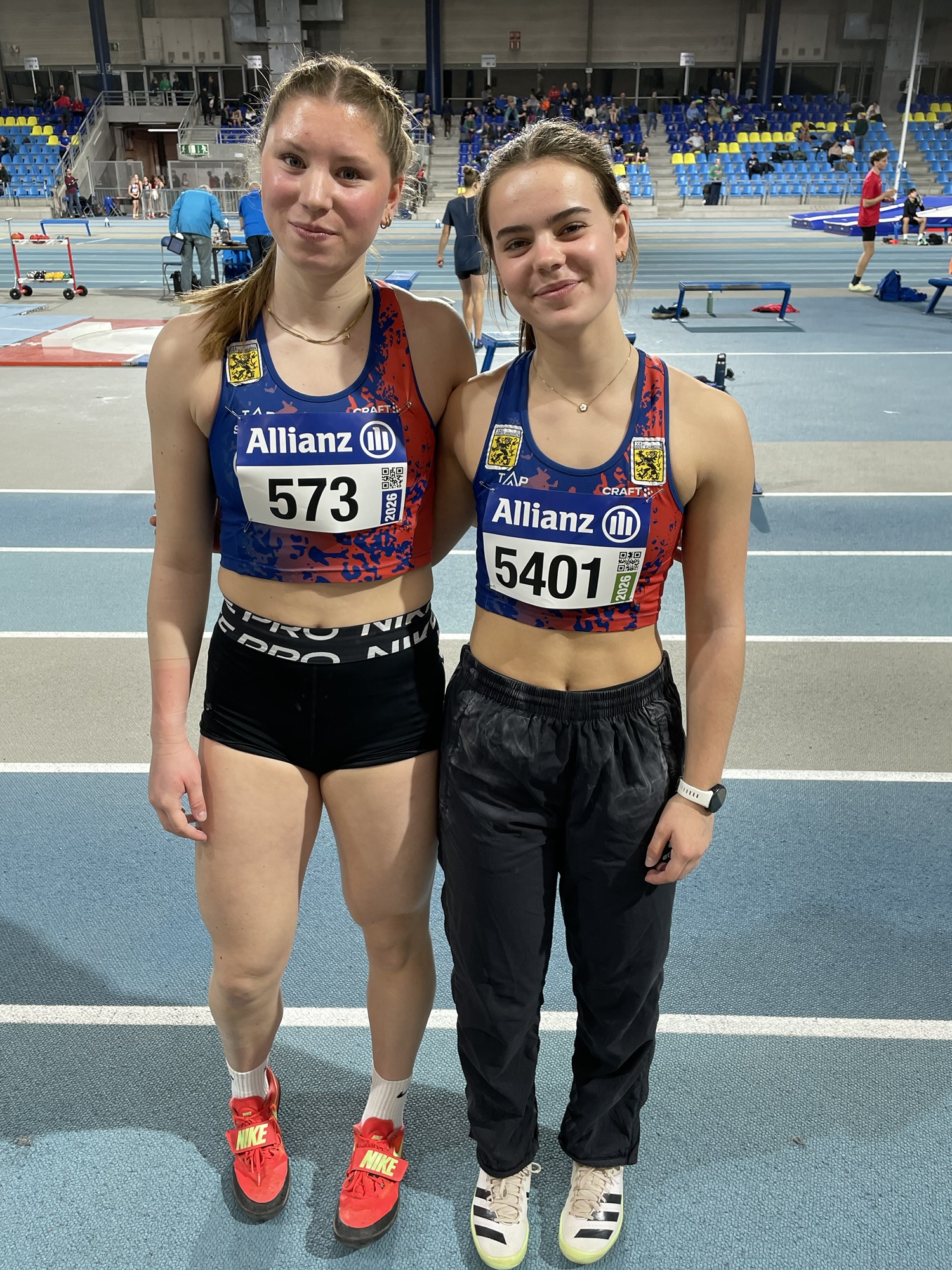 Eerstejaars belofte Inge Eeckhout en tweedejaars juniore Loes De Meyer hebben al wat meer ervaring met de 4kg. Beiden deden het voortreffelijk in hun eerste wedstrijd van het seizoen. Zo realiseerde Loes exact 11m, slechts 1cm onder haar indoor-PR, en kwam Inge tot een degelijke 10m31.