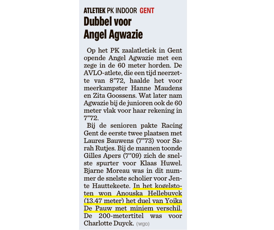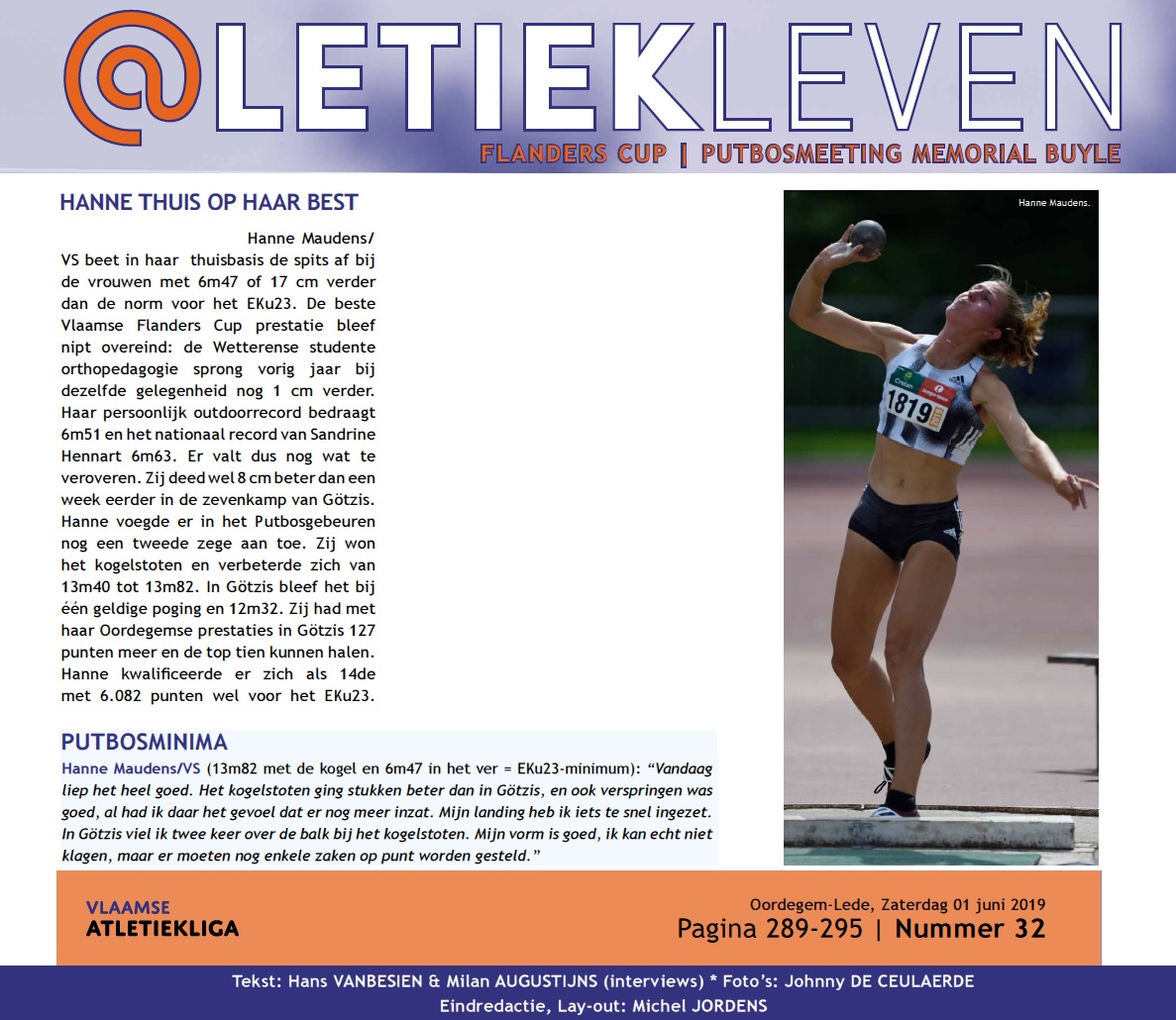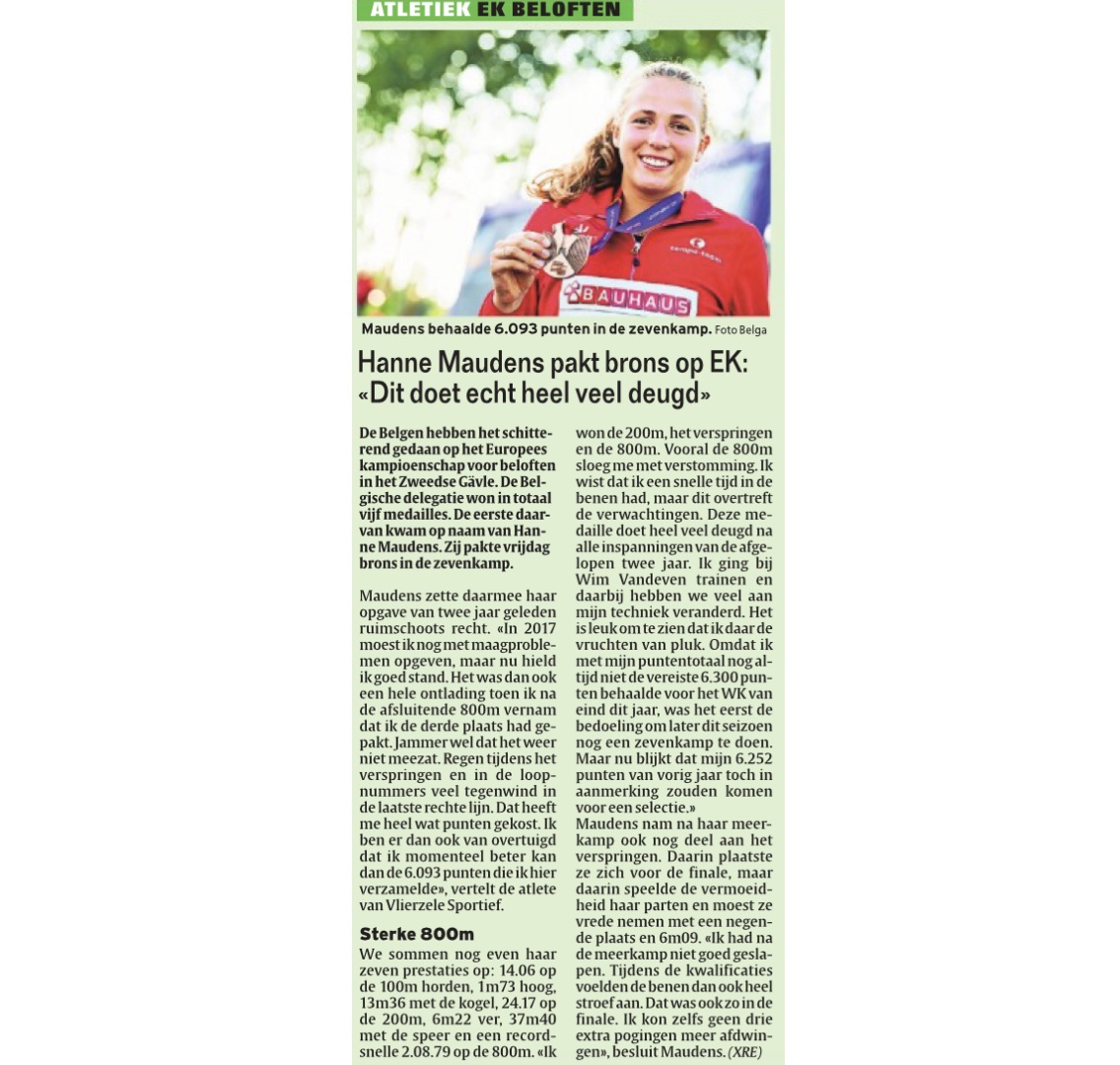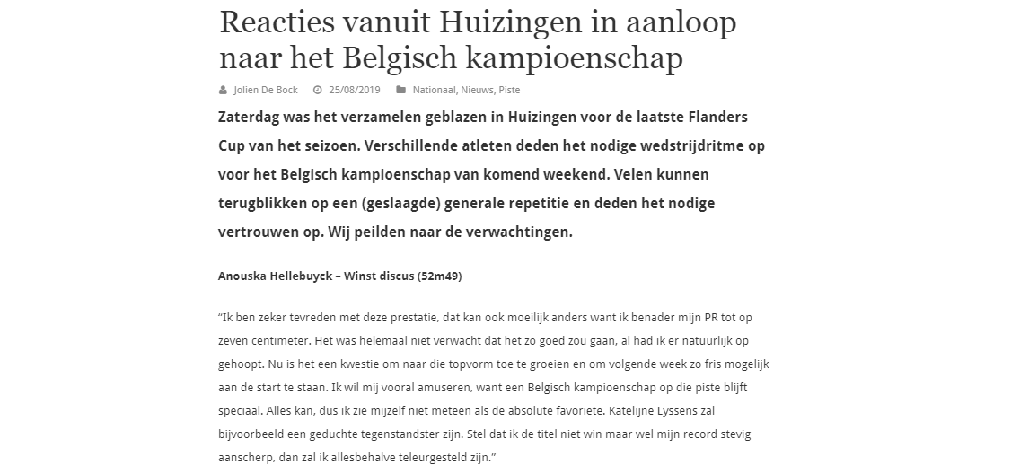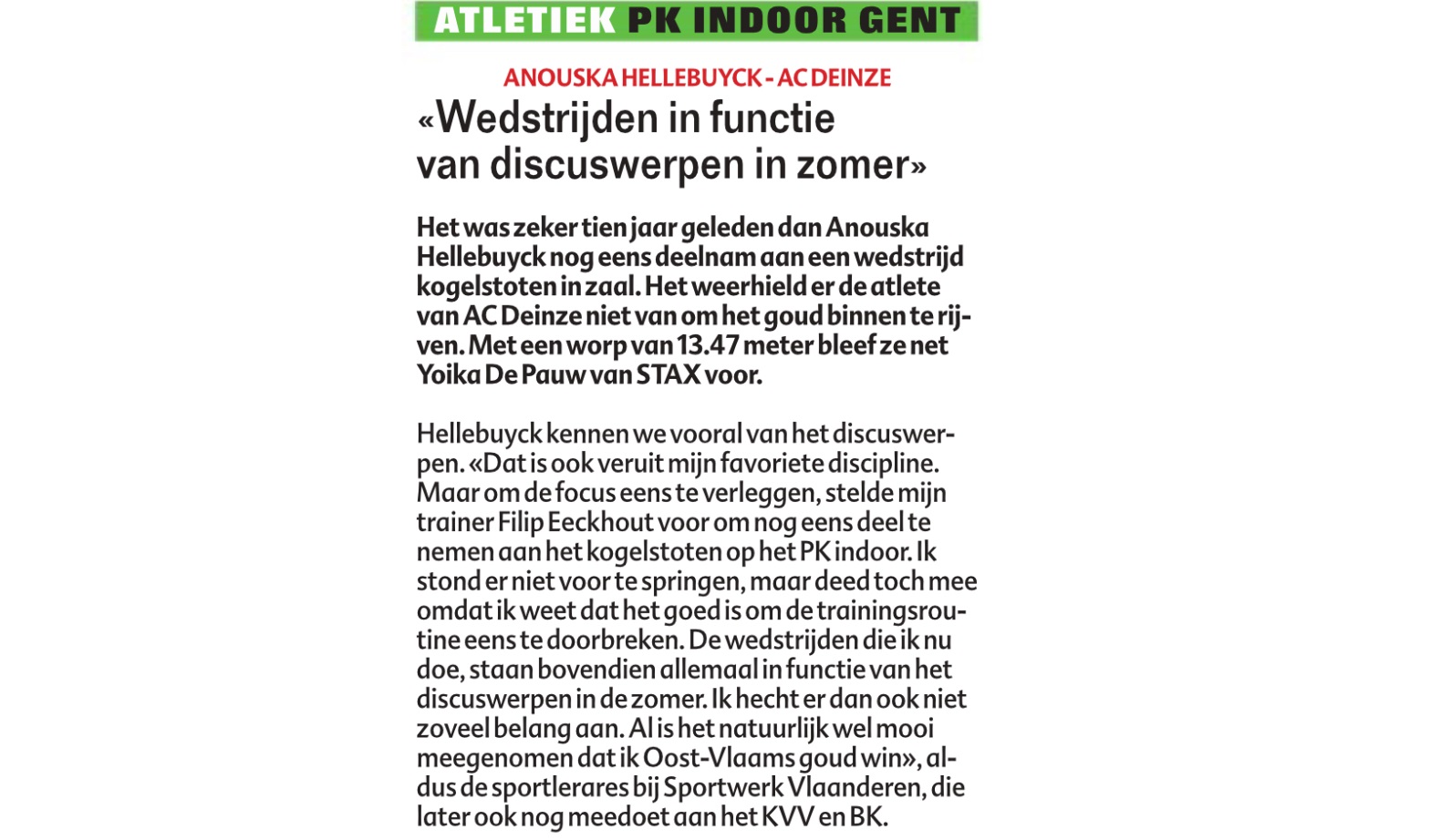Filip Eeckhout – Het Laatste Nieuws – 24/09/2019Anouska Hellebuyck – Atni.be – 25/08/2019Cédric Broeckaert – Het Laatste Nieuws – 16/08/2019Hanne Maudens – Het Laatste Nieuws – 15/07/2019Hanne Maudens – Sporza.be – 12/07/2019Hanne Maudens – Het Laatste Nieuws – 11/07/2019Hanne Maudens – Het Nieuwsblad – 10/07/2019Filip Eeckhout – Het Nieuwsblad – 03/07/2019Filip Eeckhout – atletiek.be – 30/06/2019Filip Eeckhout – @tletiekleven – 25/06/2019Filip Eeckhout – Het Nieuwsblad – 21/06/2019Anouska Hellebuyck – Het Laatste Nieuws – 12/06/2019Hanne Maudens – Het Laatste Nieuwe – 07/06/2019Hanne Maudens – @tletiekleven – 05/06/2019Anouska Hellebuyck – Het Nieuwsblad – 01/06/2019Hanne Maudens – Het Laatste Nieuws – 11/05/2019Cédric Broeckaert, Anderas De Lathouwer & Levi Denolf – @tletiekleven – 10/05/2019Hanne Maudens – Het Nieuwsblad – 02/05/2019Hanne Maudens & Filip Eeckhout – Het Laatste Nieuws – 18/04/2019Filip Eeckhout – Het Laatste Nieuws – 07/03/2019Arnaud De Cremer – Het Laatste Nieuws – 05/03/2019Hanne Maudens – Het Laatste Nieuws – 04/03/2019Hanne Maudens – Het Nieuwsblad – 20/02/2019Hanne Maudens – sporza.be – 10/02/2019Hanne Maudens – Het Nieuwsblad – 04/02/2019Hanne Maudens – atletiek.be – 02/02/2019Hanne Maudens – Het Laatste Nieuws – 15/01/2019Hanne Maudens – Het Nieuwsblad – 14/01/2019Anouska Hellebuyck – Het Nieuwsblad – 10/01/2019Anouska Hellebuyck – Het Laatste Nieuws – 08/01/2019Anouska Hellebuyck – Het Nieuwsblad – 07/01/2019Hanne Maudens – Het Laatste Nieuws – 17/12/2018Hanne Maudens – Het Nieuwsblad – 23/10/2018Hanne Maudens – sporza.be – 22/10/2018Hanne Maudens – atletiek.be – 22/10/2018