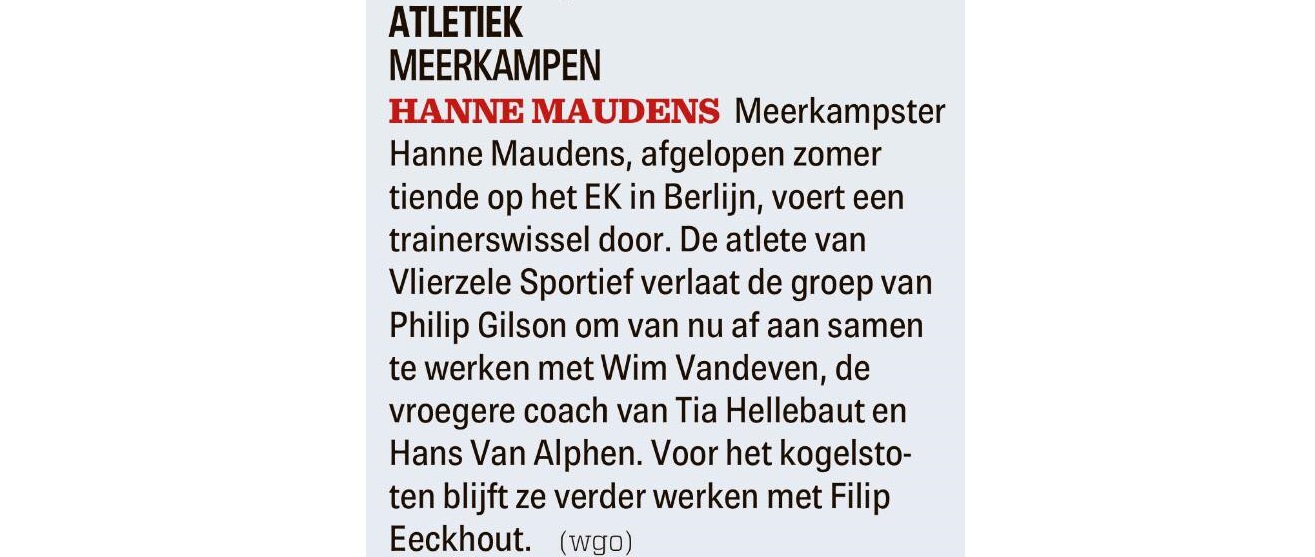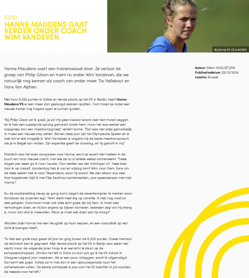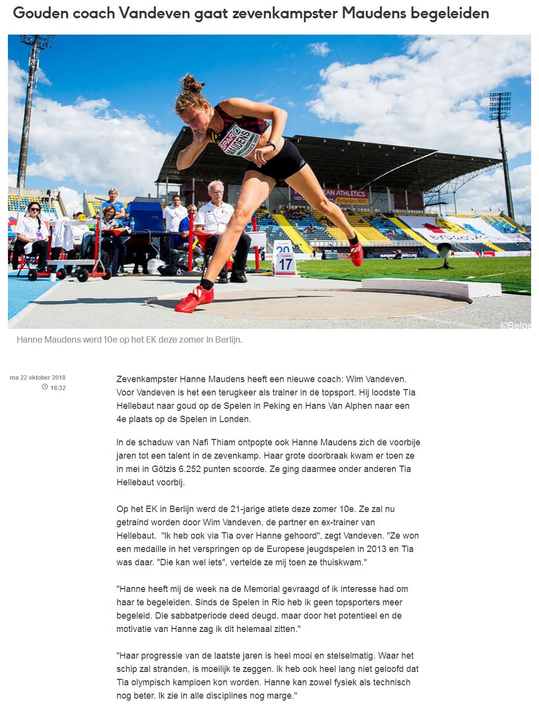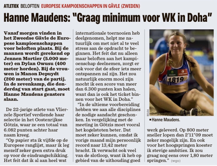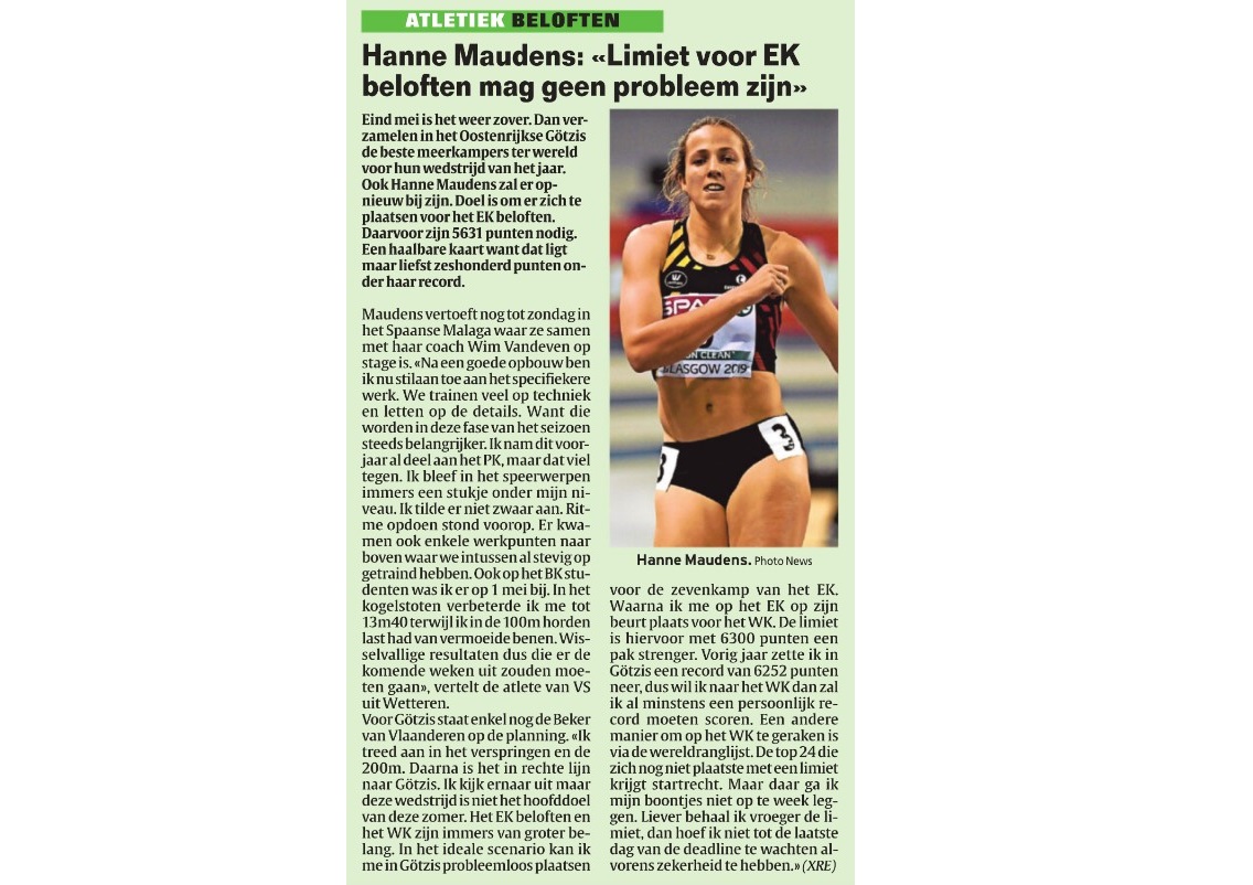 Filip Eeckhout – Het Laatste Nieuws – 24/09/2019Anouska Hellebuyck – Atni.be – 25/08/2019Cédric Broeckaert – Het Laatste Nieuws – 16/08/2019Hanne Maudens – Het Laatste Nieuws – 15/07/2019Hanne Maudens – Sporza.be – 12/07/2019Hanne Maudens – Het Laatste Nieuws – 11/07/2019Hanne Maudens – Het Nieuwsblad – 10/07/2019Filip Eeckhout – Het Nieuwsblad – 03/07/2019Filip Eeckhout – atletiek.be – 30/06/2019Filip Eeckhout – @tletiekleven – 25/06/2019Filip Eeckhout – Het Nieuwsblad – 21/06/2019Anouska Hellebuyck – Het Laatste Nieuws – 12/06/2019Hanne Maudens – Het Laatste Nieuwe – 07/06/2019Hanne Maudens – @tletiekleven – 05/06/2019Anouska Hellebuyck – Het Nieuwsblad – 01/06/2019Hanne Maudens – Het Laatste Nieuws – 11/05/2019Cédric Broeckaert, Anderas De Lathouwer & Levi Denolf – @tletiekleven – 10/05/2019Hanne Maudens – Het Nieuwsblad – 02/05/2019Hanne Maudens & Filip Eeckhout – Het Laatste Nieuws – 18/04/2019Filip Eeckhout – Het Laatste Nieuws – 07/03/2019Arnaud De Cremer – Het Laatste Nieuws – 05/03/2019Hanne Maudens – Het Laatste Nieuws – 04/03/2019Hanne Maudens – Het Nieuwsblad – 20/02/2019Hanne Maudens – sporza.be – 10/02/2019Hanne Maudens – Het Nieuwsblad – 04/02/2019Hanne Maudens – atletiek.be – 02/02/2019Hanne Maudens – Het Laatste Nieuws – 15/01/2019Hanne Maudens – Het Nieuwsblad – 14/01/2019Anouska Hellebuyck – Het Nieuwsblad – 10/01/2019Anouska Hellebuyck – Het Laatste Nieuws – 08/01/2019Anouska Hellebuyck – Het Nieuwsblad – 07/01/2019Hanne Maudens – Het Laatste Nieuws – 17/12/2018Hanne Maudens – Het Nieuwsblad – 23/10/2018Hanne Maudens – sporza.be – 22/10/2018Hanne Maudens – atletiek.be – 22/10/2018