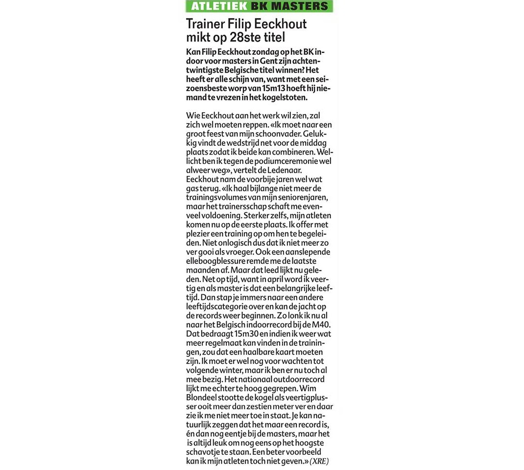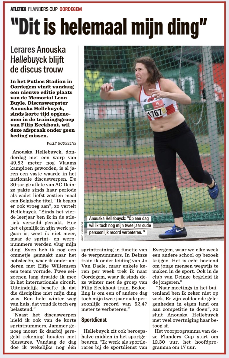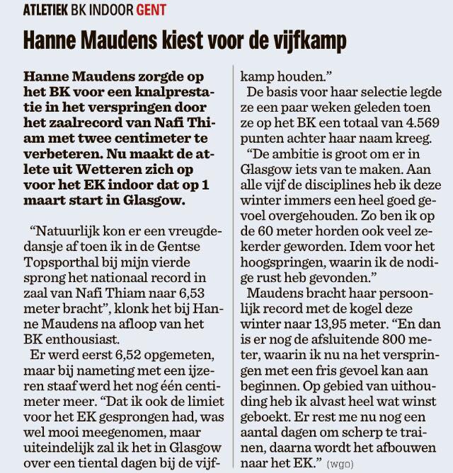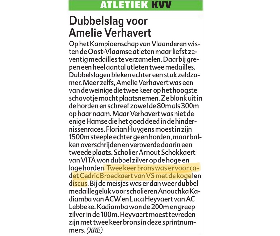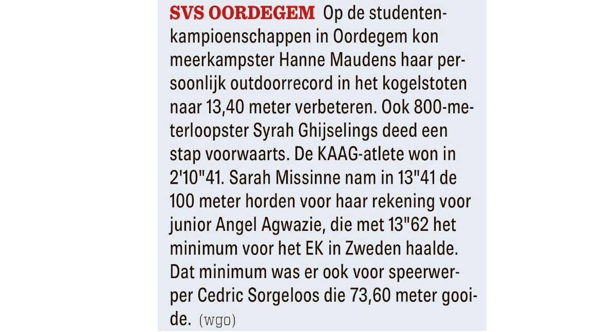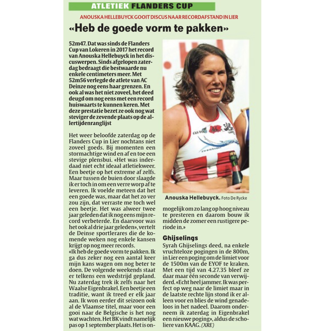 Filip Eeckhout – Het Laatste Nieuws – 24/09/2019Anouska Hellebuyck – Atni.be – 25/08/2019Cédric Broeckaert – Het Laatste Nieuws – 16/08/2019Hanne Maudens – Het Laatste Nieuws – 15/07/2019Hanne Maudens – Sporza.be – 12/07/2019Hanne Maudens – Het Laatste Nieuws – 11/07/2019Hanne Maudens – Het Nieuwsblad – 10/07/2019Filip Eeckhout – Het Nieuwsblad – 03/07/2019Filip Eeckhout – atletiek.be – 30/06/2019Filip Eeckhout – @tletiekleven – 25/06/2019Filip Eeckhout – Het Nieuwsblad – 21/06/2019Anouska Hellebuyck – Het Laatste Nieuws – 12/06/2019Hanne Maudens – Het Laatste Nieuwe – 07/06/2019Hanne Maudens – @tletiekleven – 05/06/2019Anouska Hellebuyck – Het Nieuwsblad – 01/06/2019Hanne Maudens – Het Laatste Nieuws – 11/05/2019Cédric Broeckaert, Anderas De Lathouwer & Levi Denolf – @tletiekleven – 10/05/2019Hanne Maudens – Het Nieuwsblad – 02/05/2019Hanne Maudens & Filip Eeckhout – Het Laatste Nieuws – 18/04/2019Filip Eeckhout – Het Laatste Nieuws – 07/03/2019Arnaud De Cremer – Het Laatste Nieuws – 05/03/2019Hanne Maudens – Het Laatste Nieuws – 04/03/2019Hanne Maudens – Het Nieuwsblad – 20/02/2019Hanne Maudens – sporza.be – 10/02/2019Hanne Maudens – Het Nieuwsblad – 04/02/2019Hanne Maudens – atletiek.be – 02/02/2019Hanne Maudens – Het Laatste Nieuws – 15/01/2019Hanne Maudens – Het Nieuwsblad – 14/01/2019Anouska Hellebuyck – Het Nieuwsblad – 10/01/2019Anouska Hellebuyck – Het Laatste Nieuws – 08/01/2019Anouska Hellebuyck – Het Nieuwsblad – 07/01/2019Hanne Maudens – Het Laatste Nieuws – 17/12/2018Hanne Maudens – Het Nieuwsblad – 23/10/2018Hanne Maudens – sporza.be – 22/10/2018Hanne Maudens – atletiek.be – 22/10/2018
