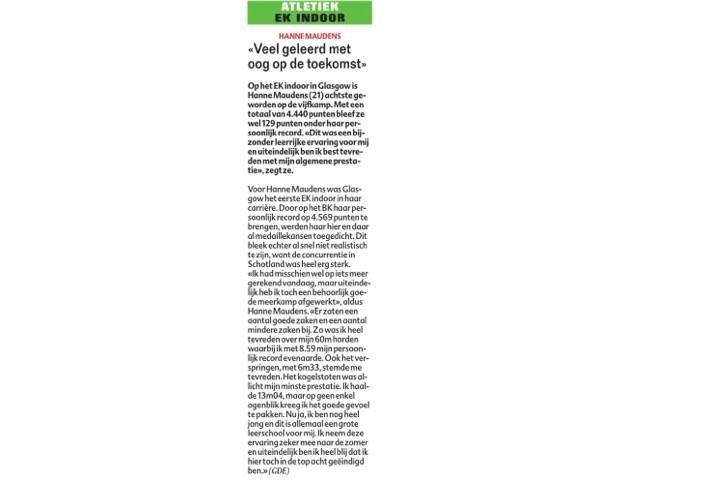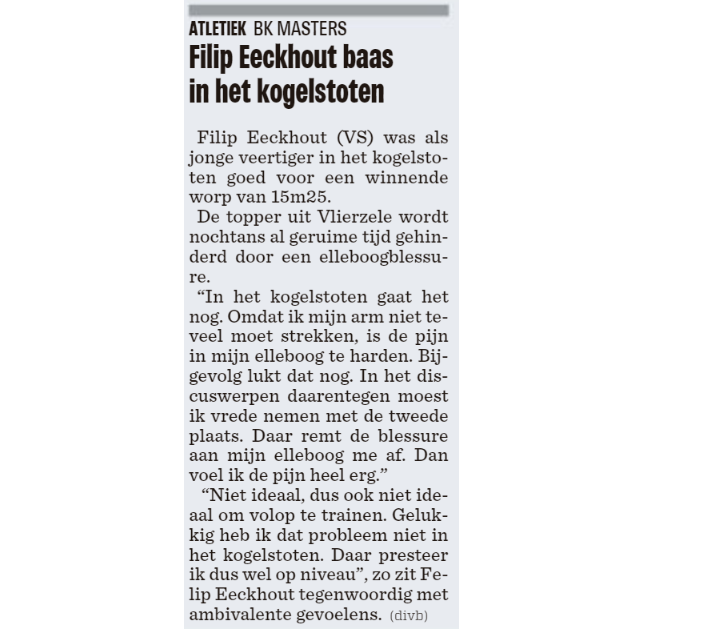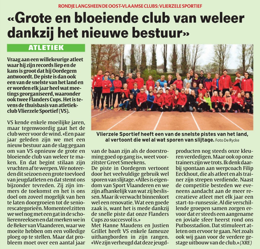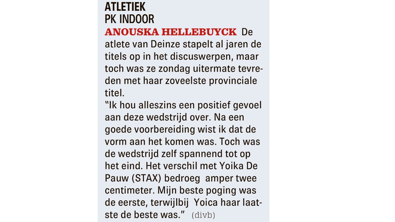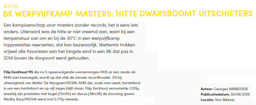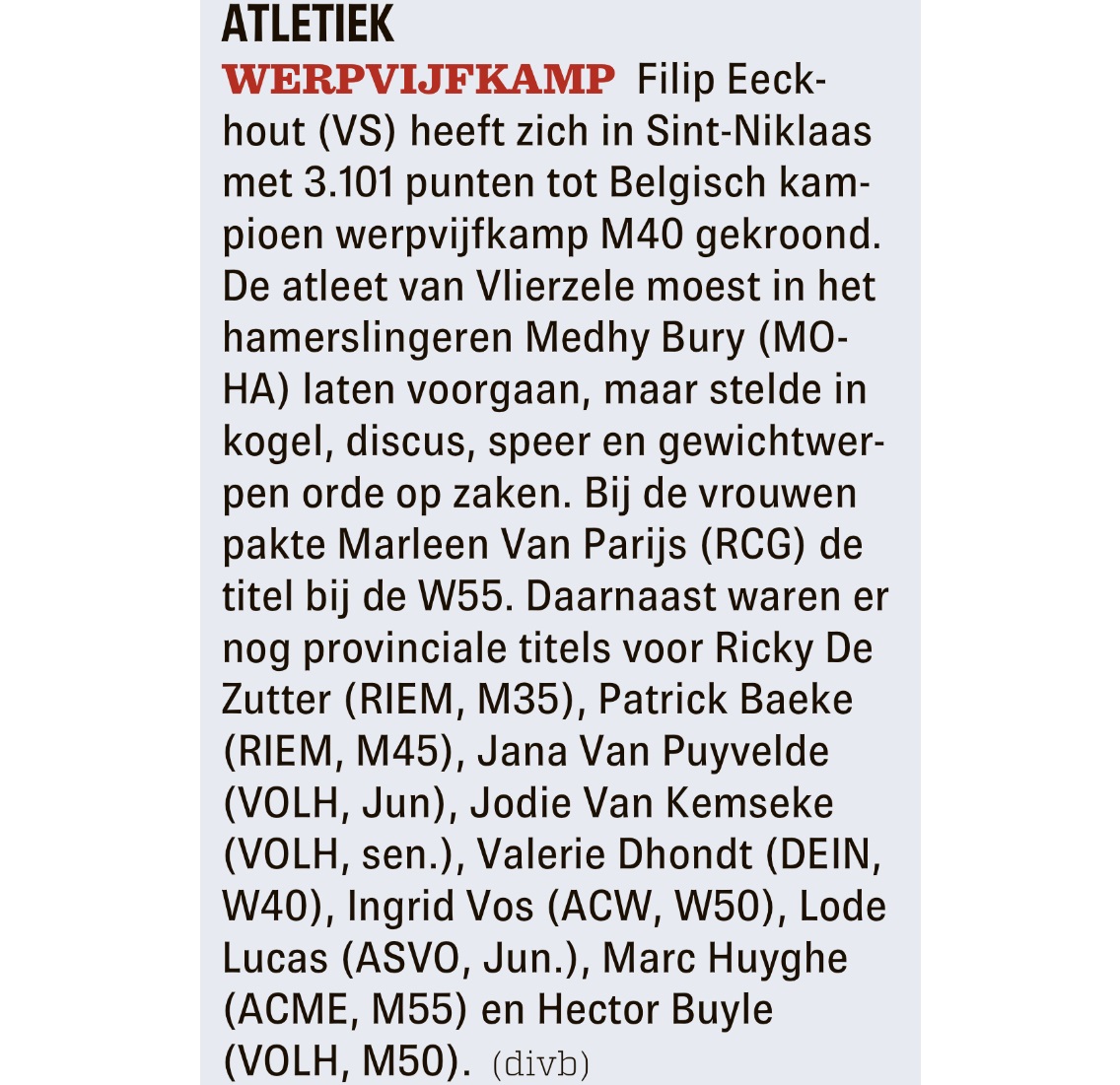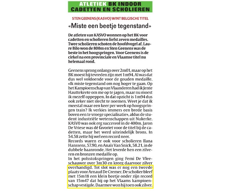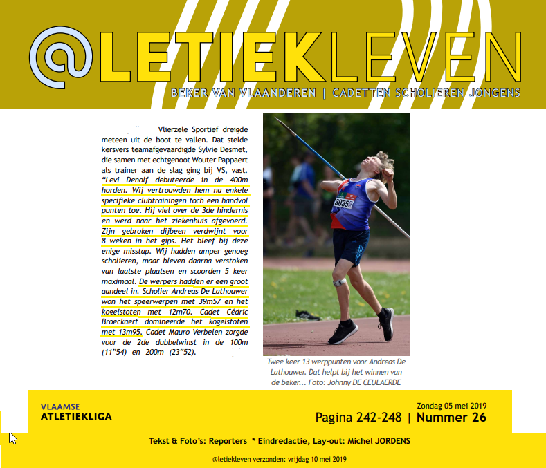 Filip Eeckhout – Het Laatste Nieuws – 24/09/2019Anouska Hellebuyck – Atni.be – 25/08/2019Cédric Broeckaert – Het Laatste Nieuws – 16/08/2019Hanne Maudens – Het Laatste Nieuws – 15/07/2019Hanne Maudens – Sporza.be – 12/07/2019Hanne Maudens – Het Laatste Nieuws – 11/07/2019Hanne Maudens – Het Nieuwsblad – 10/07/2019Filip Eeckhout – Het Nieuwsblad – 03/07/2019Filip Eeckhout – atletiek.be – 30/06/2019Filip Eeckhout – @tletiekleven – 25/06/2019Filip Eeckhout – Het Nieuwsblad – 21/06/2019Anouska Hellebuyck – Het Laatste Nieuws – 12/06/2019Hanne Maudens – Het Laatste Nieuwe – 07/06/2019Hanne Maudens – @tletiekleven – 05/06/2019Anouska Hellebuyck – Het Nieuwsblad – 01/06/2019Hanne Maudens – Het Laatste Nieuws – 11/05/2019Cédric Broeckaert, Anderas De Lathouwer & Levi Denolf – @tletiekleven – 10/05/2019Hanne Maudens – Het Nieuwsblad – 02/05/2019Hanne Maudens & Filip Eeckhout – Het Laatste Nieuws – 18/04/2019Filip Eeckhout – Het Laatste Nieuws – 07/03/2019Arnaud De Cremer – Het Laatste Nieuws – 05/03/2019Hanne Maudens – Het Laatste Nieuws – 04/03/2019Hanne Maudens – Het Nieuwsblad – 20/02/2019Hanne Maudens – sporza.be – 10/02/2019Hanne Maudens – Het Nieuwsblad – 04/02/2019Hanne Maudens – atletiek.be – 02/02/2019Hanne Maudens – Het Laatste Nieuws – 15/01/2019Hanne Maudens – Het Nieuwsblad – 14/01/2019Anouska Hellebuyck – Het Nieuwsblad – 10/01/2019Anouska Hellebuyck – Het Laatste Nieuws – 08/01/2019Anouska Hellebuyck – Het Nieuwsblad – 07/01/2019Hanne Maudens – Het Laatste Nieuws – 17/12/2018Hanne Maudens – Het Nieuwsblad – 23/10/2018Hanne Maudens – sporza.be – 22/10/2018Hanne Maudens – atletiek.be – 22/10/2018