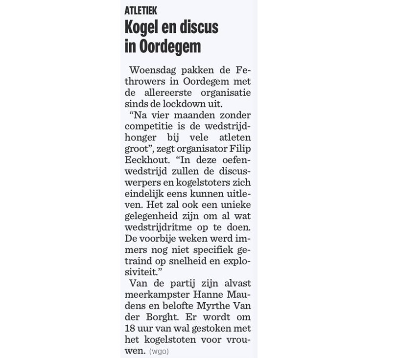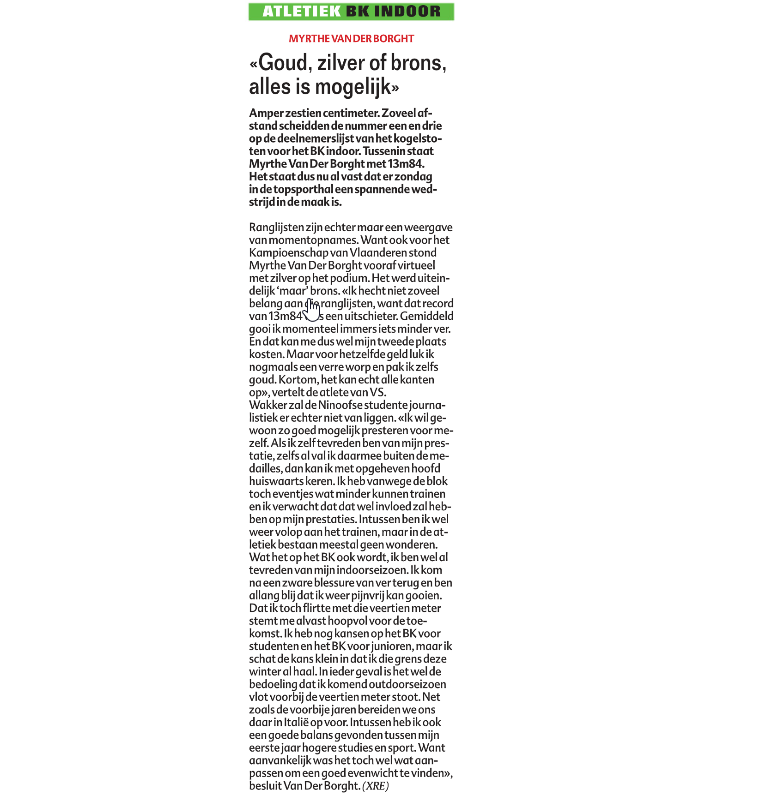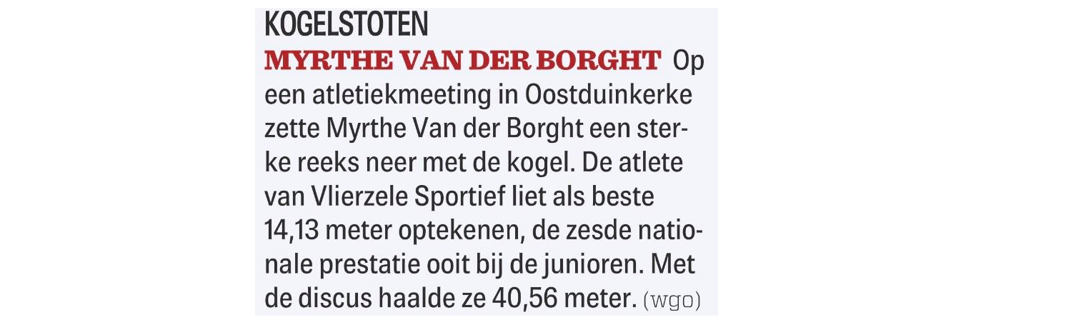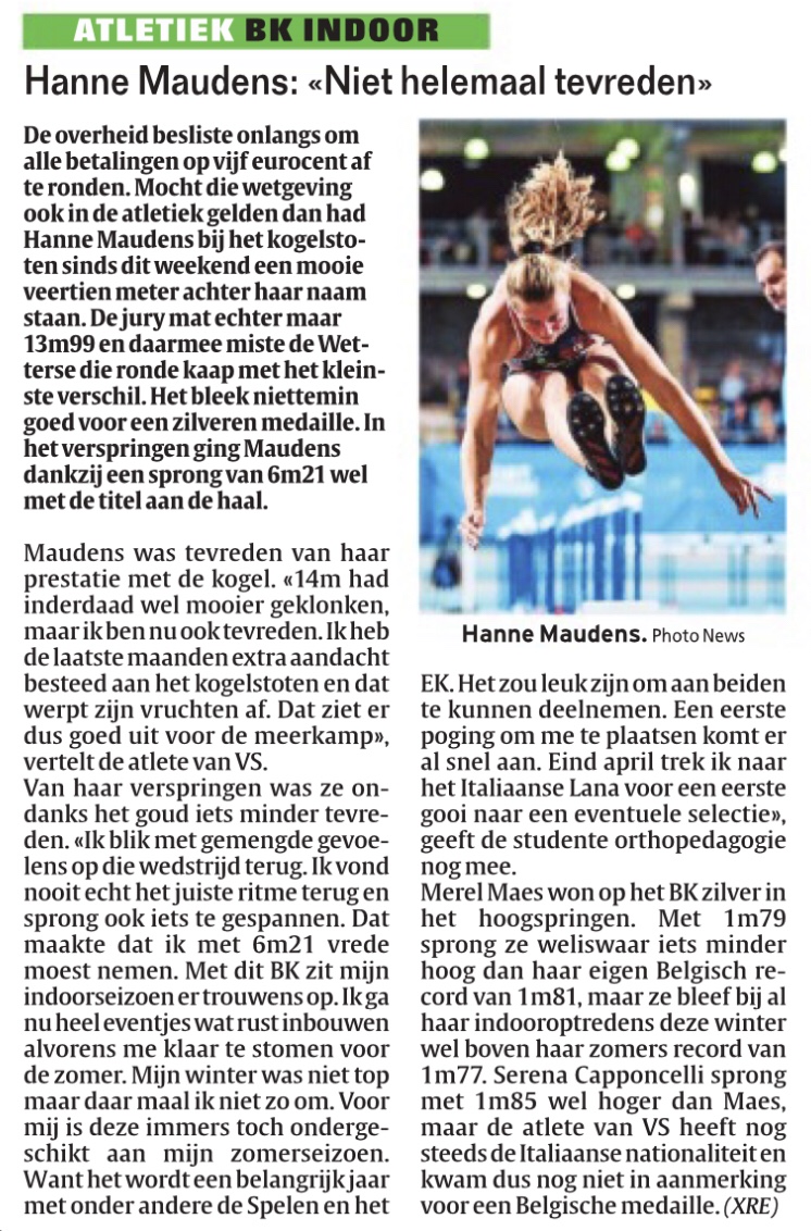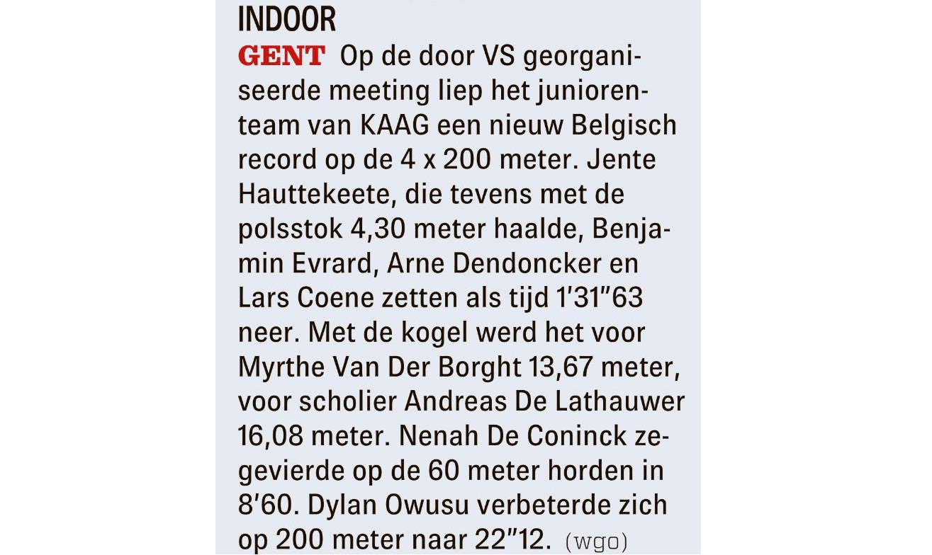 Myrthe Van der Borght – Het Laatste Nieuws – 27/08/2020Myrthe Van der Borght – Het Laatste Nieuws – 25/08/2020Myrthe Van der Borght – Ninofmedia.tv – 25/08/2020Myrthe Van der Borght – Het Laatste Nieuws – 07/08/2020Myrthe Van der Borght – Het Laatste Nieuws – 06/08/2020Myrthe Van der Borght – Het Nieuwsblad – 04/08/2020Filip Eeckhout, Hanne Maudens, Andreas De Lathauwer & Myrthe Van der Borght – Het Nieuwsblad – 03/07/2020Filip Eeckhout, Hanne Maudens & Myrthe Van der Borght – Het Nieuwsblad – 30/06/2020Filip Eeckhout – @tletiekleven – 17/03/2020Hanne Maudens – @tletiekleven – 20/02/2020Hanne Maudens & Myrthe Van der Borght – Het Nieuwsblad – 19/02/2020Hanne Maudens – Het Laatste Nieuws – 17/02/2020Myrthe Van der Borght – Het Laatste Nieuws – 14/02/2020Nina Denolf & Hanne Maudens – @tletiekleven – 05/02/2020Hanne Maudens – Het Laatste Nieuws – 05/02/2020Hanne Maudens & FEThrowers – Het Laatste Nieuws – 23/01/2020Andreas De Lathauwer – Het Laatste Nieuws – 21/01/2020Andreas De Lathauwer – Het Nieuwsblad – 18/01/2020Myrthe Van der Borght & Andreas De Lathauwer – Het Nieuwsblad – 13/01/2020Filip Eeckhout – Het Laatste Nieuws – 11/01/2020Filip Eeckhout, Andreas De Lathauwer & Myrthe Van der Borght – @tletiekleven – 10/01/2020Myrthe Van der Borght, Andreas De Lathauwer & Filip Eeckhout – Het Nieuwsblad – 06/01/2020Filip Eeckhout – Het Laatste Nieuws – 06/01/2020Myrthe Van der Borght & Andreas De Lathauwer – Het Nieuwsblad – 31/12/2019Andreas De Lathauwer & Filip Eeckhout – Het Laatste Nieuws – 31/12/2019Myrthe Van der Borght & Andreas De Lathauwer – Het Laatste Nieuws – 24/12/2019Myrthe Van der Borght – Het Laatste Nieuws – 19/12/2019Febe Van de Walle & Sofie Vervaeke – Het Laatste Nieuws – 10/11/2019