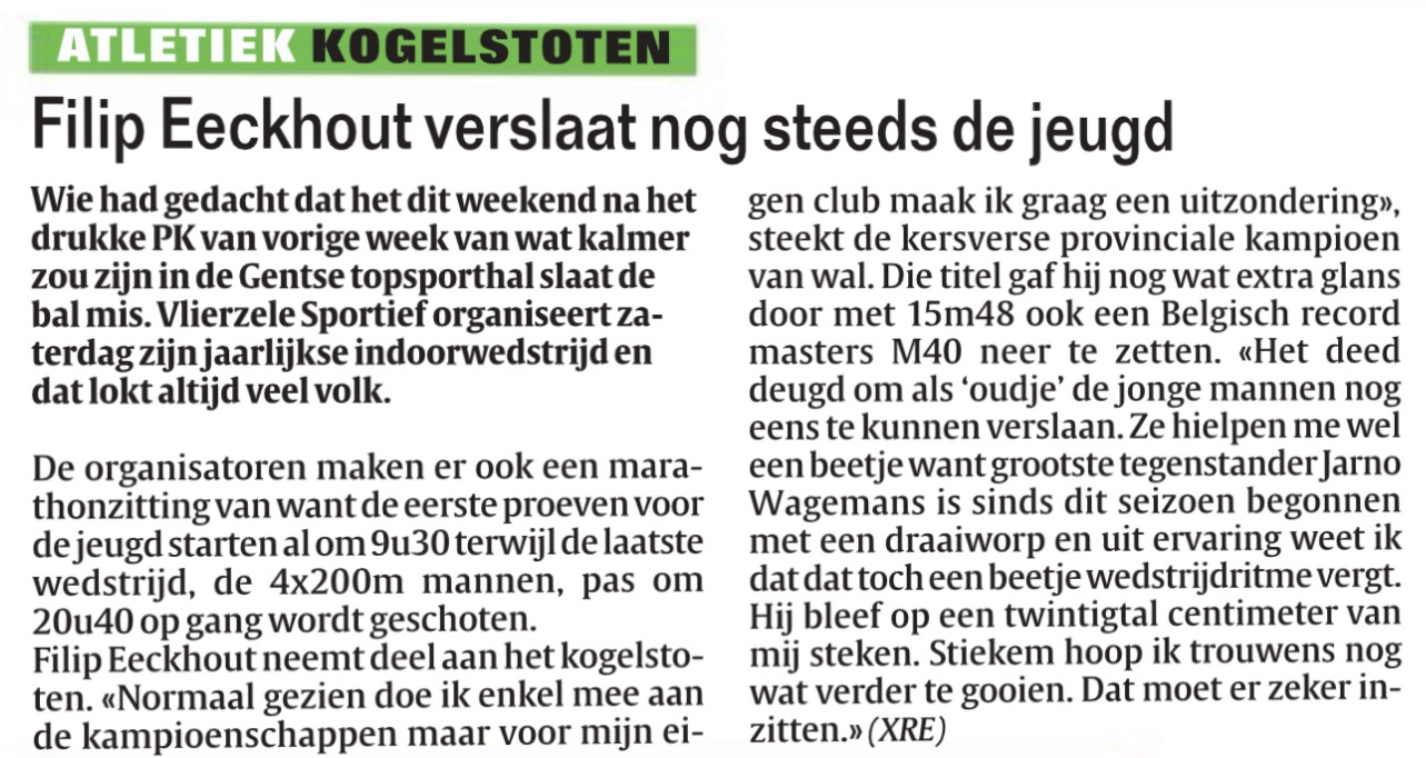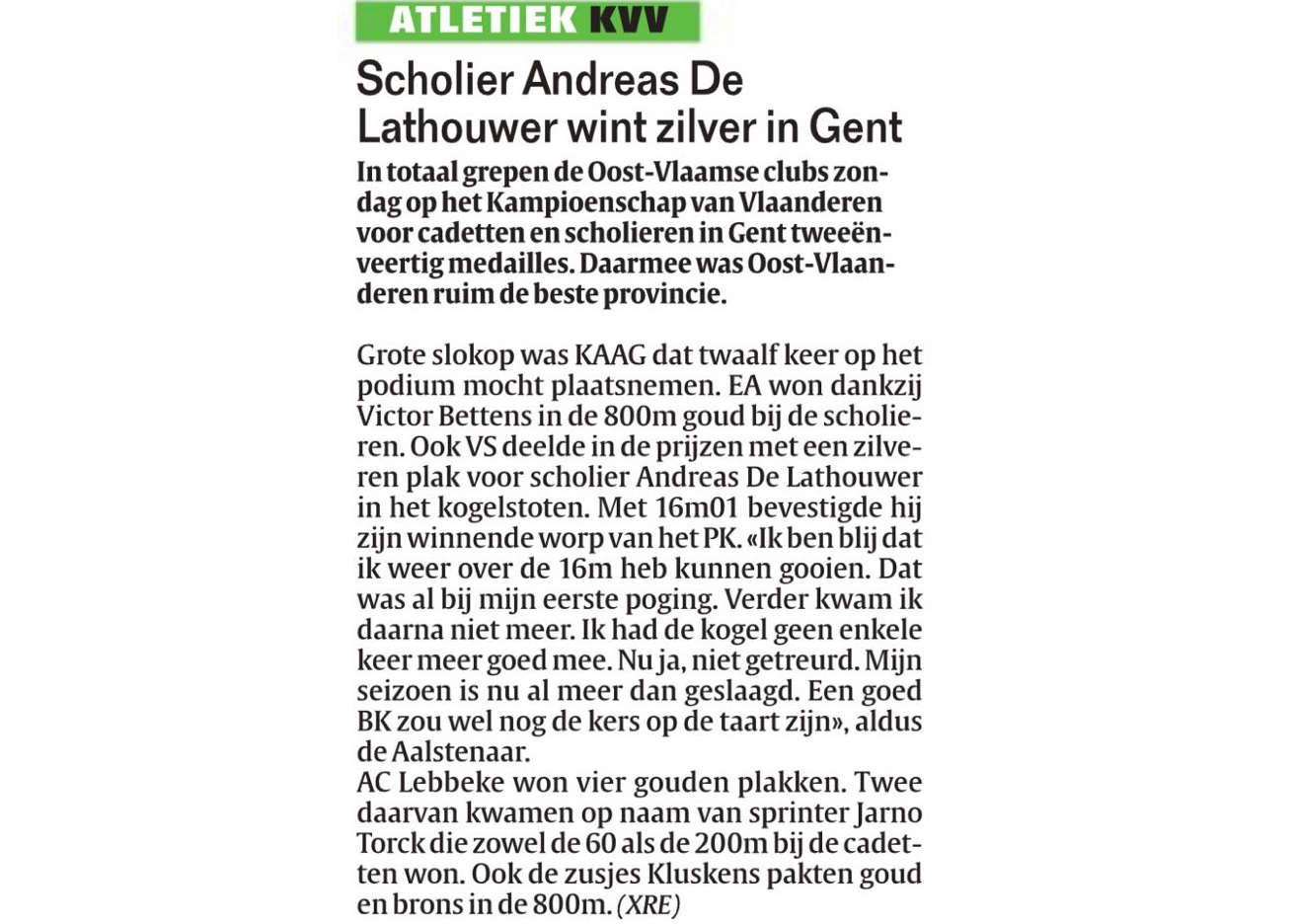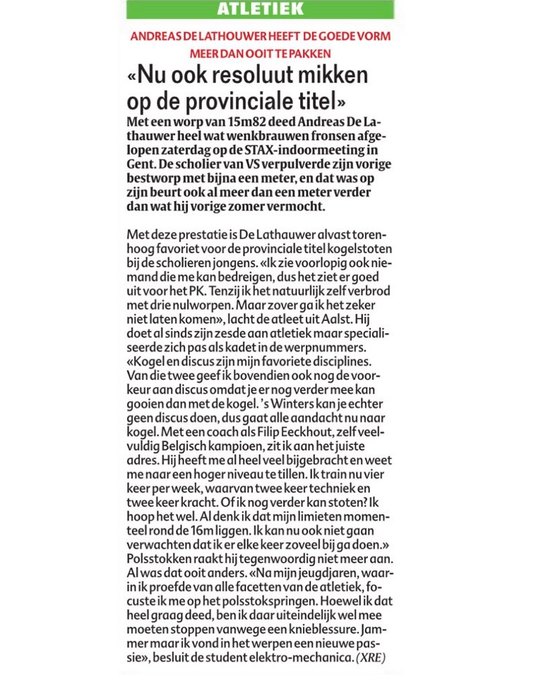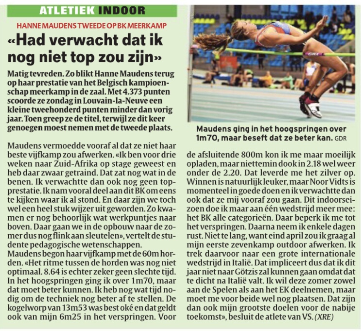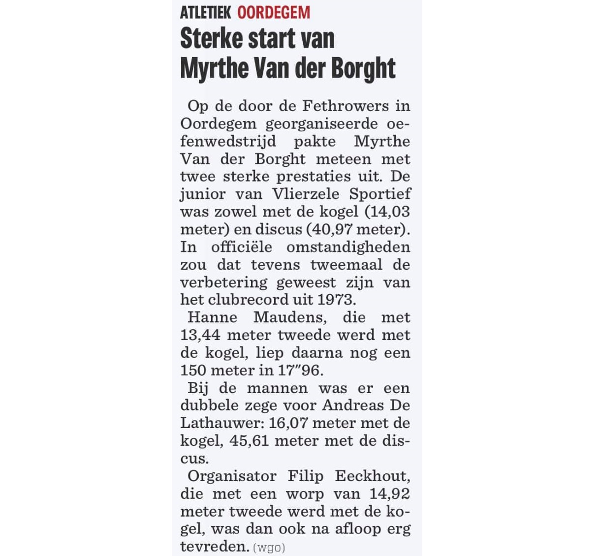 Myrthe Van der Borght – Het Laatste Nieuws – 27/08/2020Myrthe Van der Borght – Het Laatste Nieuws – 25/08/2020Myrthe Van der Borght – Ninofmedia.tv – 25/08/2020Myrthe Van der Borght – Het Laatste Nieuws – 07/08/2020Myrthe Van der Borght – Het Laatste Nieuws – 06/08/2020Myrthe Van der Borght – Het Nieuwsblad – 04/08/2020Filip Eeckhout, Hanne Maudens, Andreas De Lathauwer & Myrthe Van der Borght – Het Nieuwsblad – 03/07/2020Filip Eeckhout, Hanne Maudens & Myrthe Van der Borght – Het Nieuwsblad – 30/06/2020Filip Eeckhout – @tletiekleven – 17/03/2020Hanne Maudens – @tletiekleven – 20/02/2020Hanne Maudens & Myrthe Van der Borght – Het Nieuwsblad – 19/02/2020Hanne Maudens – Het Laatste Nieuws – 17/02/2020Myrthe Van der Borght – Het Laatste Nieuws – 14/02/2020Nina Denolf & Hanne Maudens – @tletiekleven – 05/02/2020Hanne Maudens – Het Laatste Nieuws – 05/02/2020Hanne Maudens & FEThrowers – Het Laatste Nieuws – 23/01/2020Andreas De Lathauwer – Het Laatste Nieuws – 21/01/2020Andreas De Lathauwer – Het Nieuwsblad – 18/01/2020Myrthe Van der Borght & Andreas De Lathauwer – Het Nieuwsblad – 13/01/2020Filip Eeckhout – Het Laatste Nieuws – 11/01/2020Filip Eeckhout, Andreas De Lathauwer & Myrthe Van der Borght – @tletiekleven – 10/01/2020Myrthe Van der Borght, Andreas De Lathauwer & Filip Eeckhout – Het Nieuwsblad – 06/01/2020Filip Eeckhout – Het Laatste Nieuws – 06/01/2020Myrthe Van der Borght & Andreas De Lathauwer – Het Nieuwsblad – 31/12/2019Andreas De Lathauwer & Filip Eeckhout – Het Laatste Nieuws – 31/12/2019Myrthe Van der Borght & Andreas De Lathauwer – Het Laatste Nieuws – 24/12/2019Myrthe Van der Borght – Het Laatste Nieuws – 19/12/2019Febe Van de Walle & Sofie Vervaeke – Het Laatste Nieuws – 10/11/2019