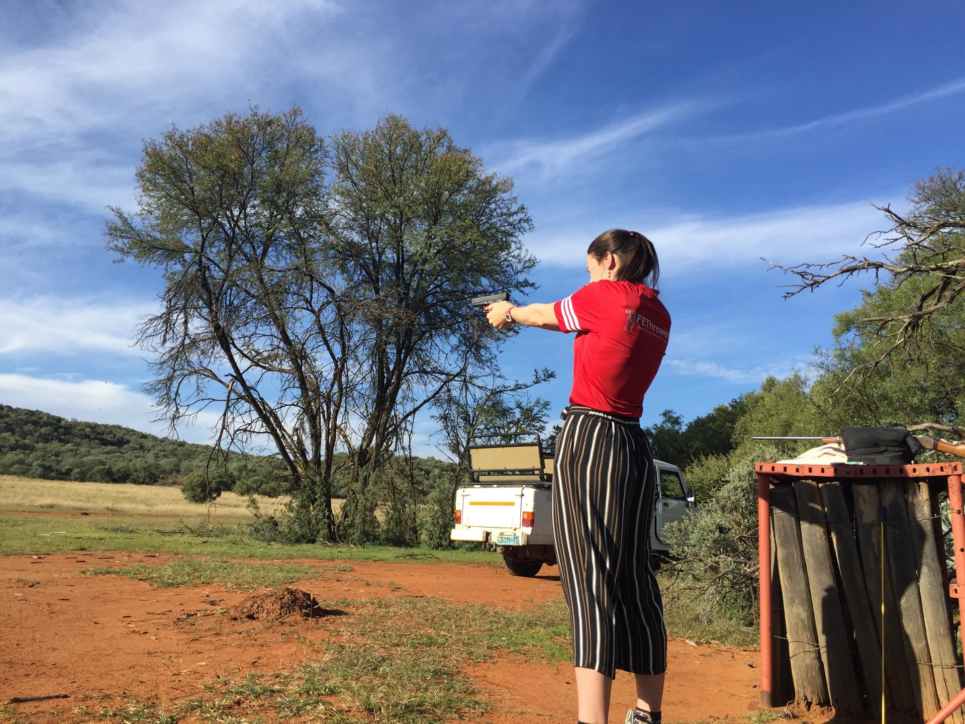 1. ZUID-AFRIKA => Cheasas Peak game lodge in Petrusburg, dicht bij Bloemfontein, schieten met een handgeweer op blikjes. Petrusburg is een plaats met 8500 inwoners, in de Zuid-Afrikaanse provincie Vrijstaat. Wikipedia