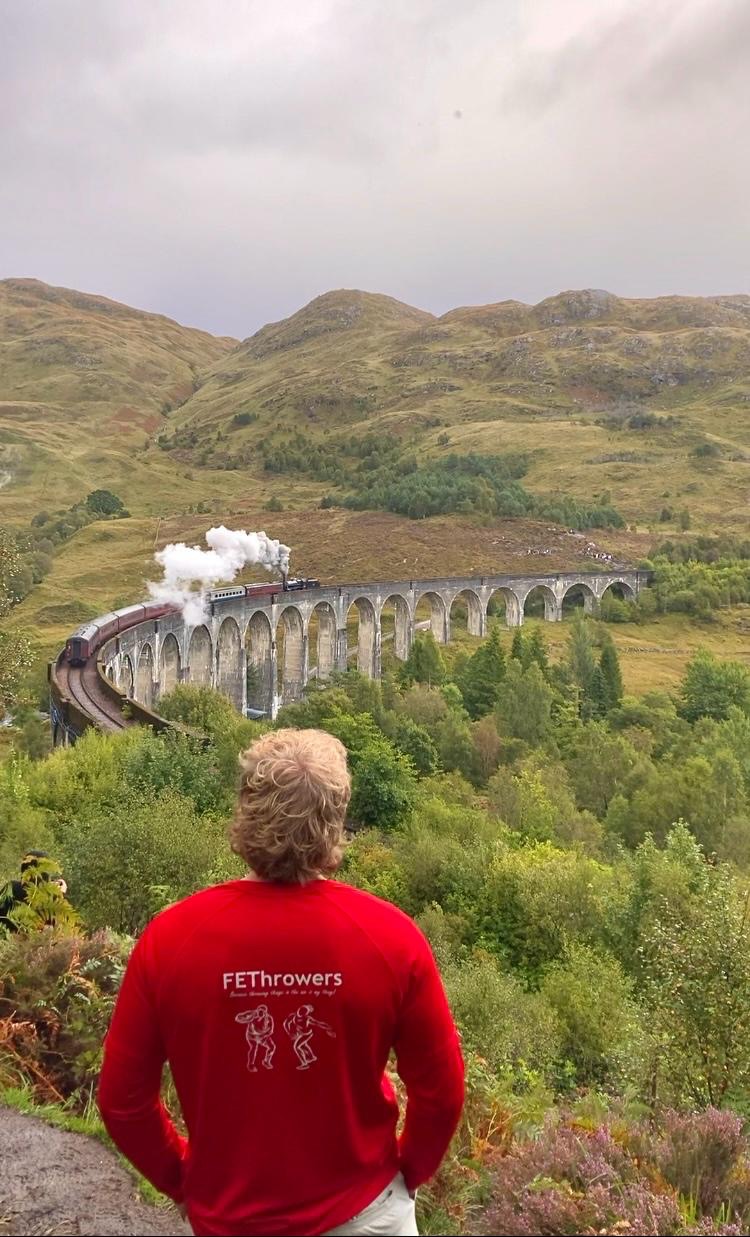 84. SCHOTLAND => Het Glenfinnanviaduct is een spoorwegviaduct in de West Highland Line tussen Fort William en Mallaig. Het werd gebouwd door de firma Sir Robert McAlpine en werd voltooid in het jaar 1901. Het viaduct, dat volledig uit beton is vervaardigd, bevat 21 bogen van elk 15 meter. In de film Harry Potter en de Geheime Kamer speelt zich een scène af tijdens de passage van de Zweinsteinexpres over het viaduct. Nadat het viaduct ook in de twee volgende films van Harry Potter verscheen, wordt het viaduct definitief in verband gebracht met de Harry Potter filmreeks. Wikipedia