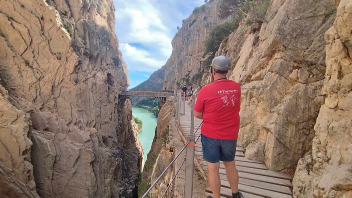 91. SPANJE => El Caminito del Rey (“Het Koningspaadje”) is een wandelpad dat loopt van Álora in Málaga naar Campillos door de El Chorro-kloof. Het pad is drie kilometer lang, maximaal een meter breed en bevindt zich 100 meter boven de rivier ‘El Chorro’ tegen de rotswanden. Het kan en mag alleen vanaf de noordelijke kant (de ingang) naar de zuidelijke kant (de uitgang) worden afgelegd. Zowel aan de noordelijke kant als aan de zuidelijke kant is de dichtstbijzijnde parkeerplaats voor auto’s en bussen een kilometer verwijderd, waardoor de totale wandeling over dit pad minimaal vijf kilometer wordt. Wikipedia